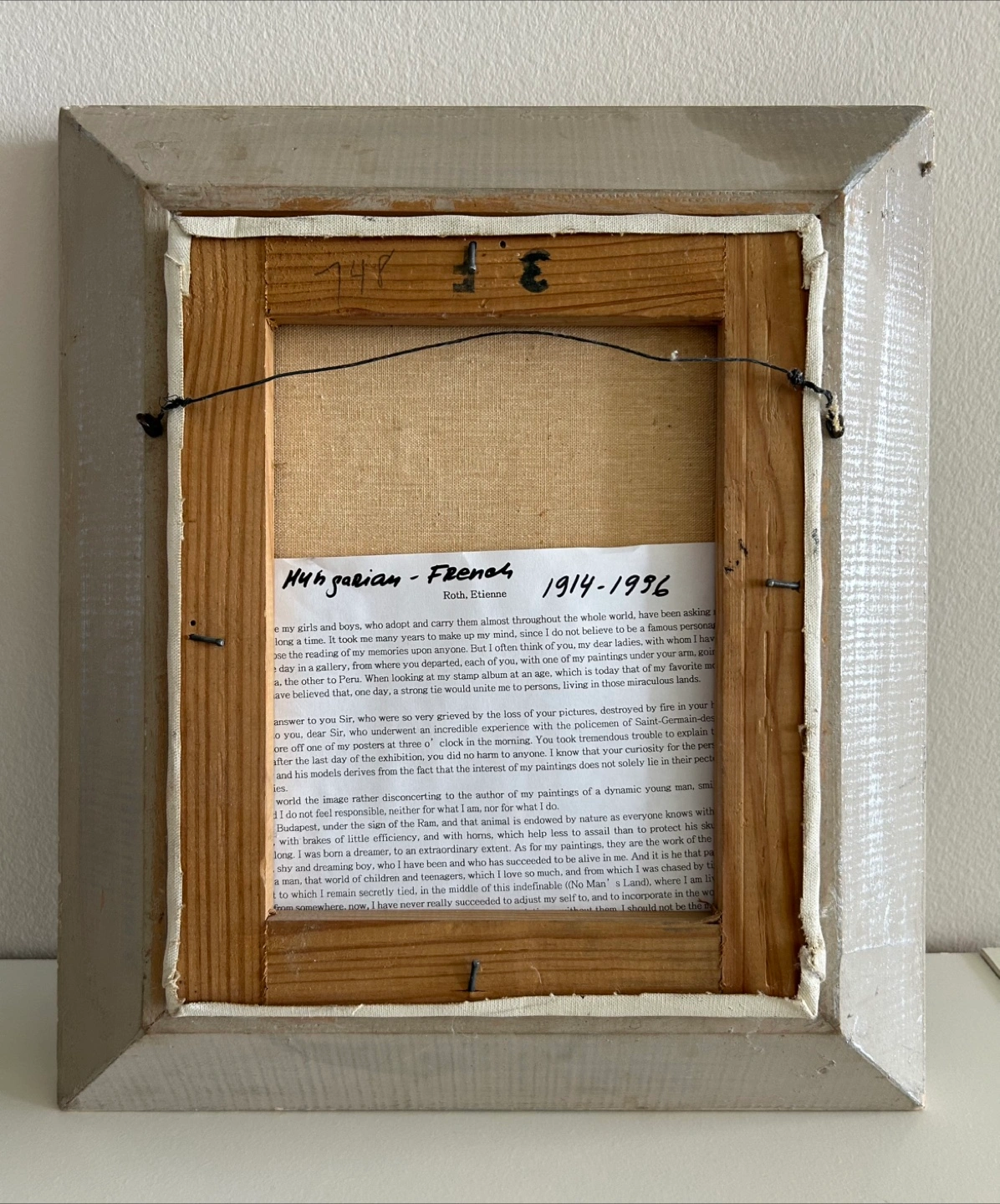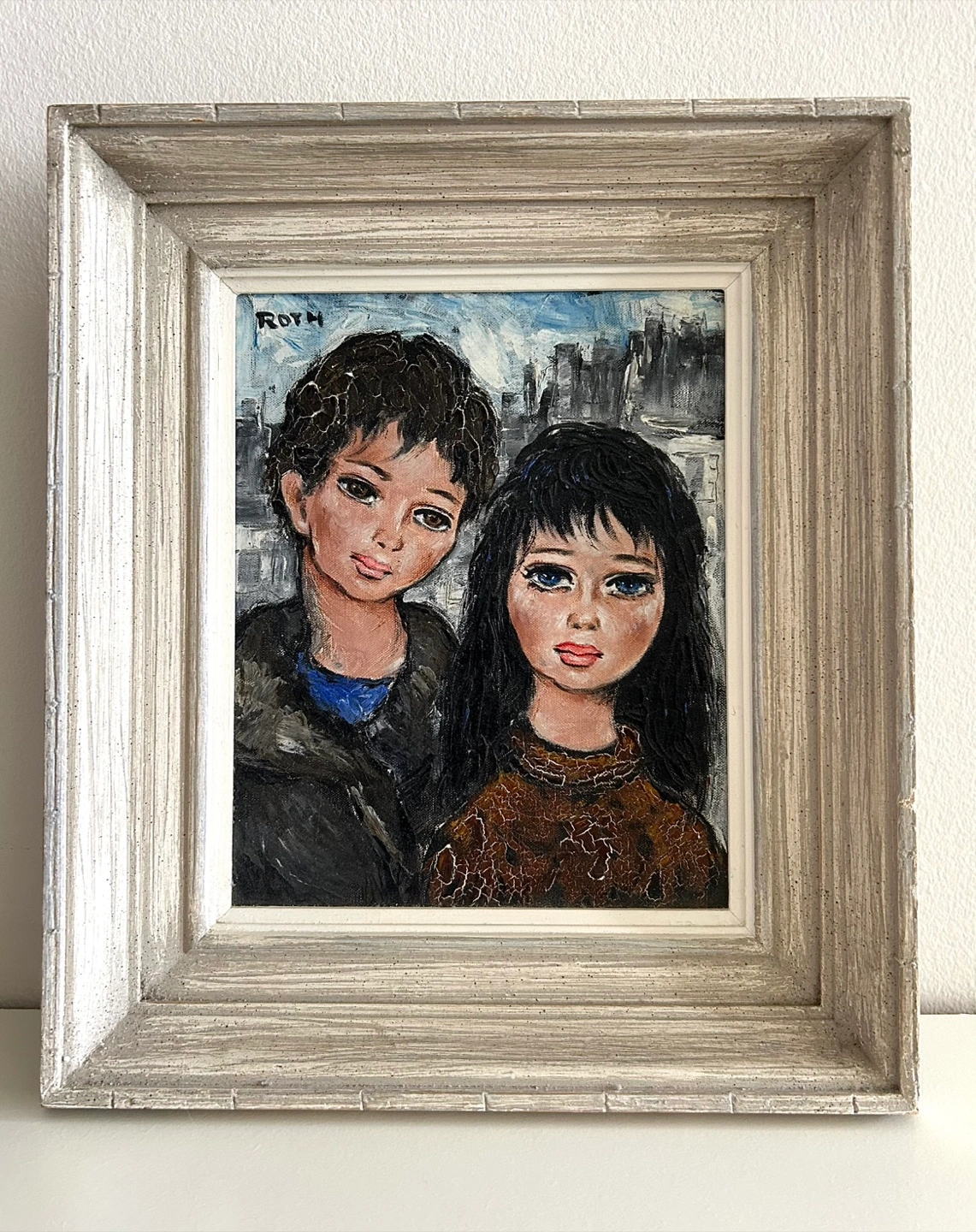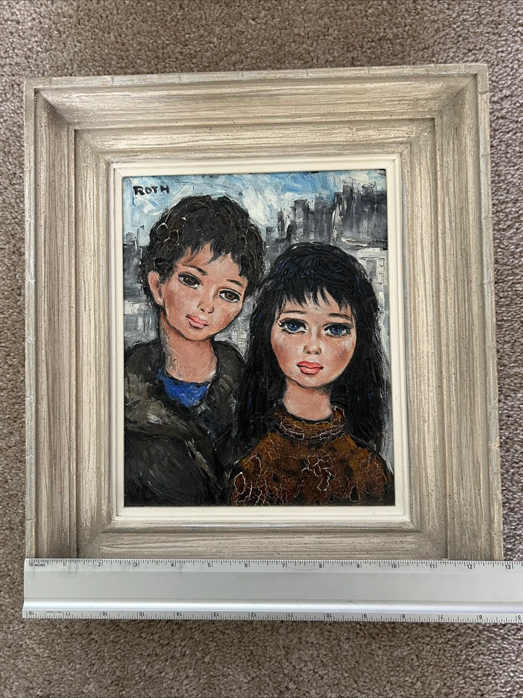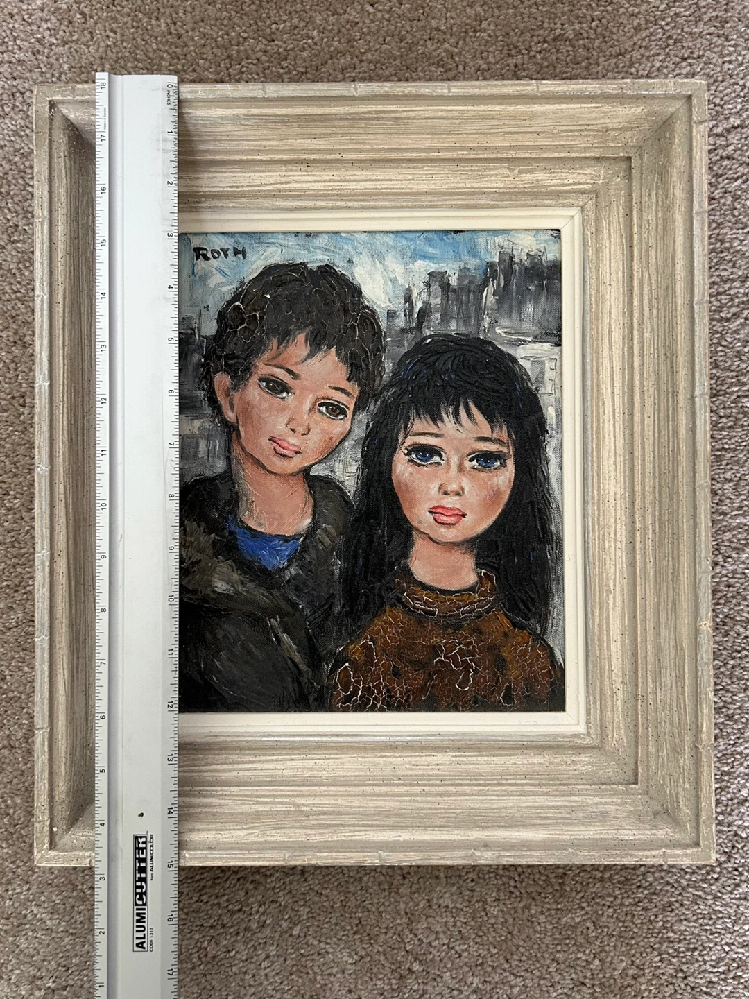 Framed artwork depicting two children. The painting is in a light gray frame. The artist's signature is visible on the painting. Measures approximately 15 x 13 inches