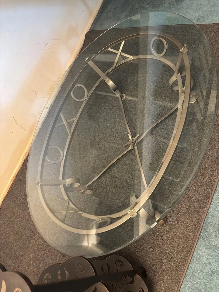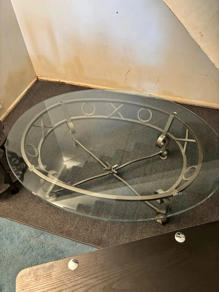 Glass XOXOXO oval table, well taken care of and in need of a new home. It is sturdy and durable. Great for the side or in the middle of your living room with a crystal like glass that will impress your family and guests.