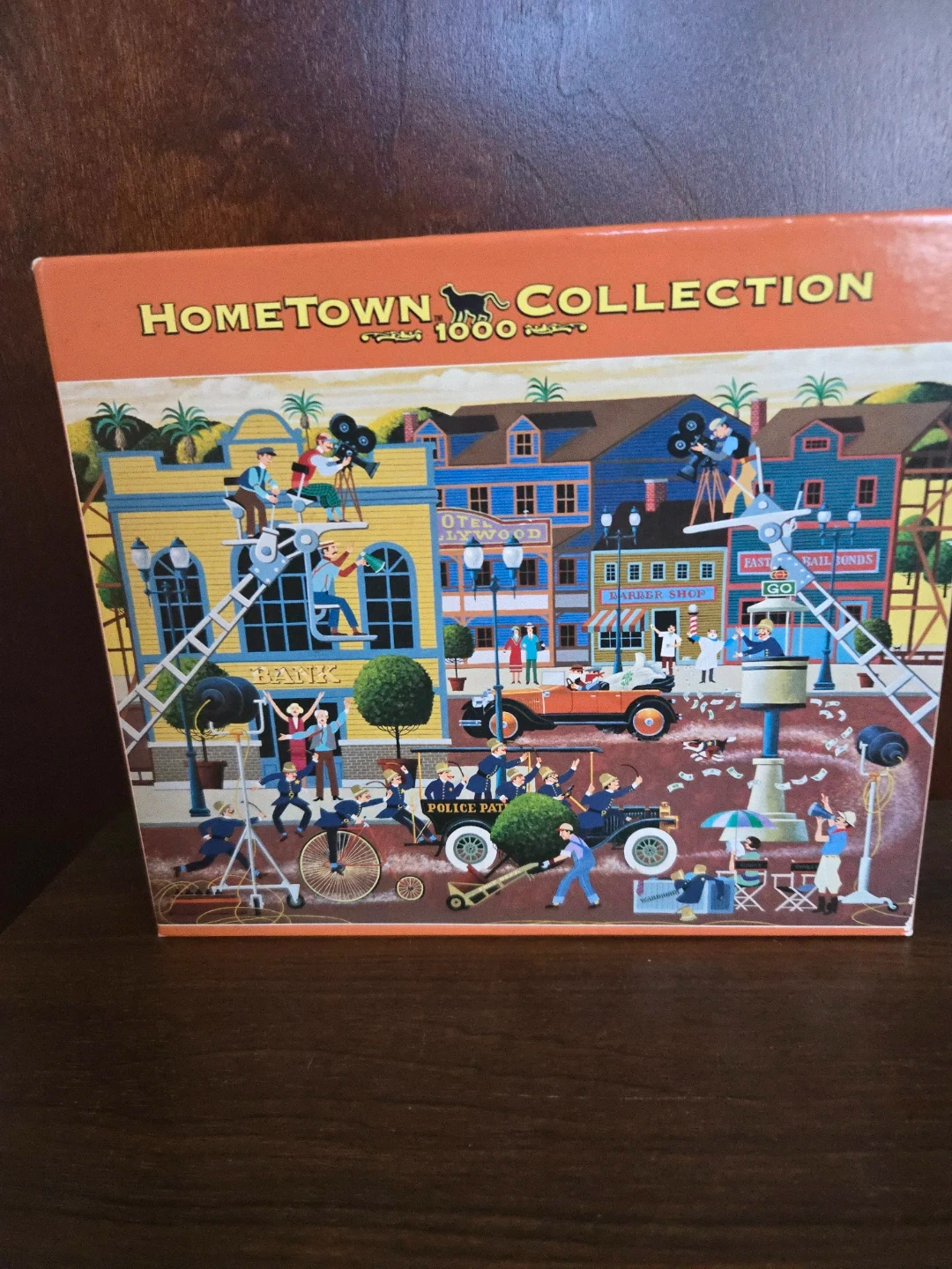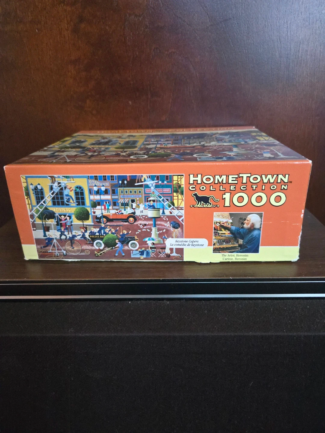 1000 piece jigsaw puzzle from the Hometown Collection. Titled 'Keystone Caper', it features a scene from the Keystone Cops era. Artwork by Hieronymus. Includes original box.