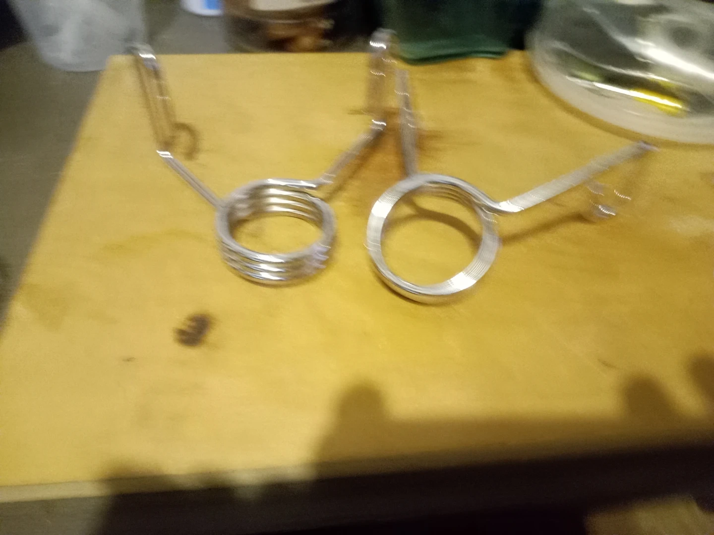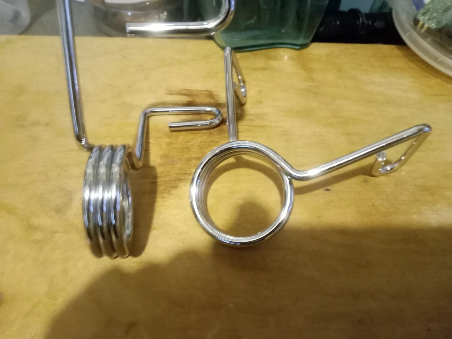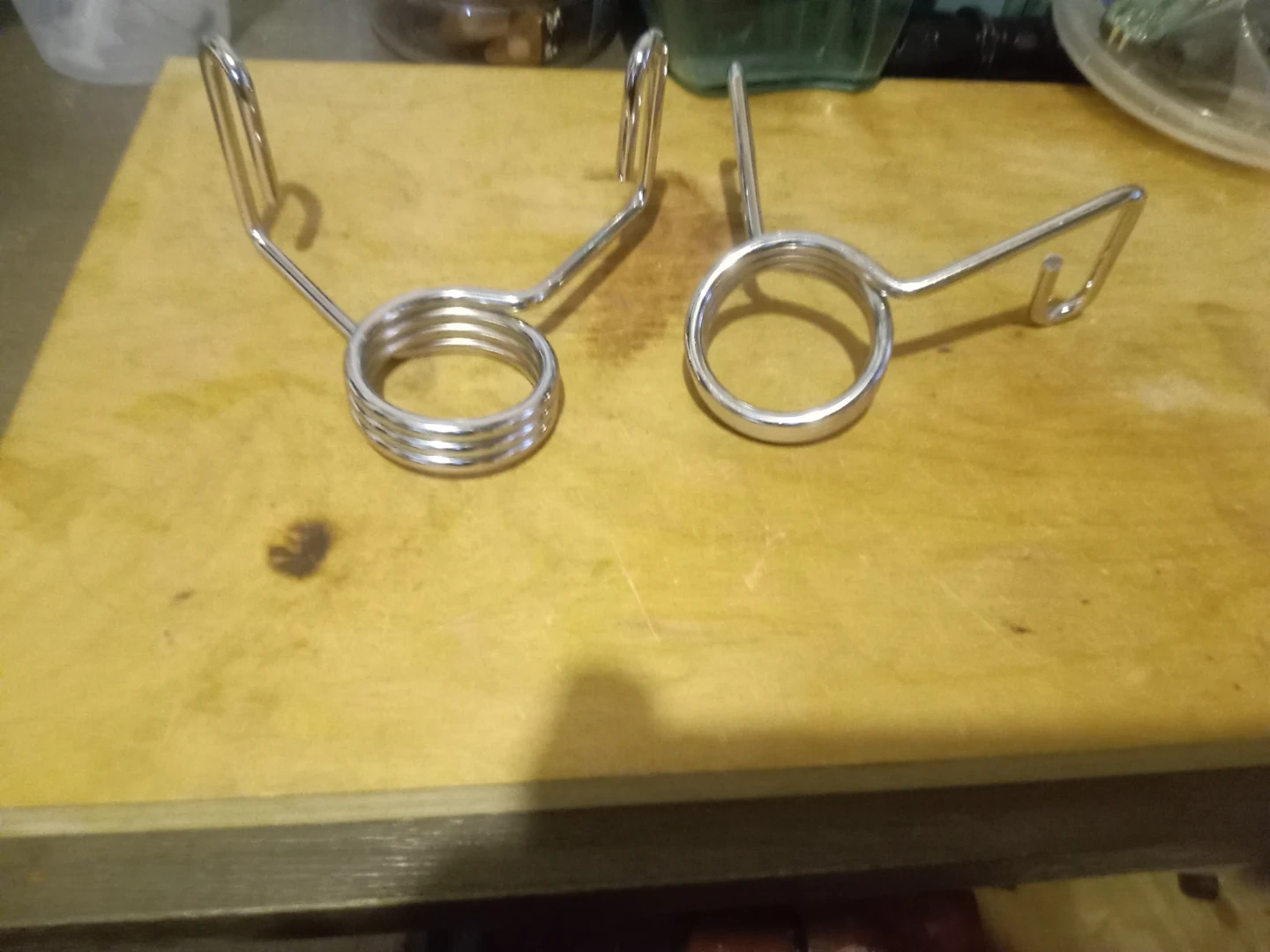 These are spring collar clips made of chrome-plated metal. They're designed to secure weight plates onto a barbell. Perfect for weightlifting and strength training!