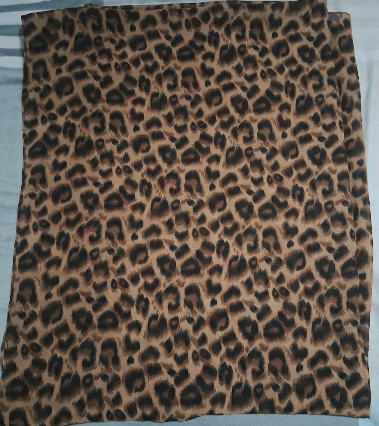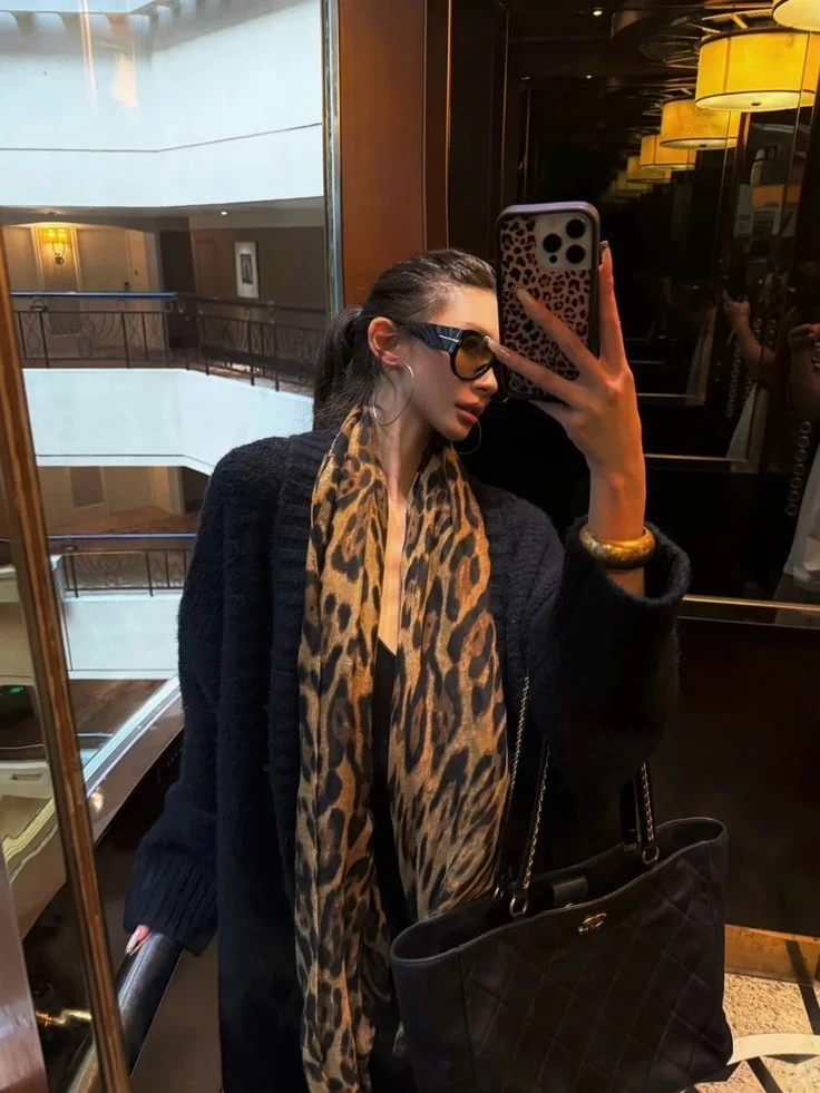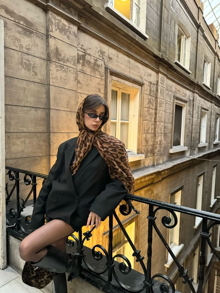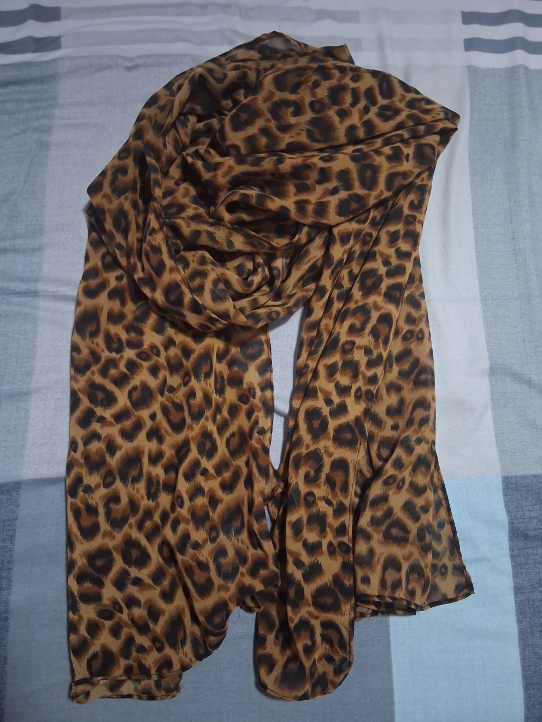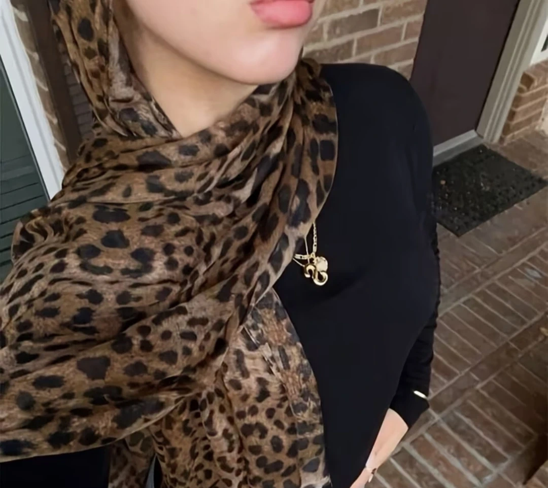 A stylish leopard print scarf adds a chic touch to any outfit. It's made from a lightweight, flowy material. This versatile accessory can be worn in various ways. It's perfect for completing a fashionable look!