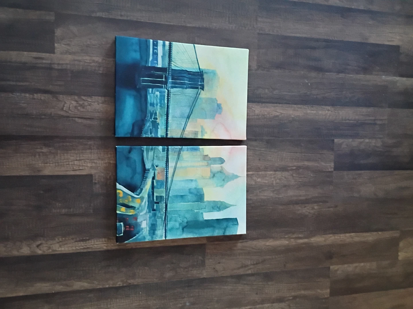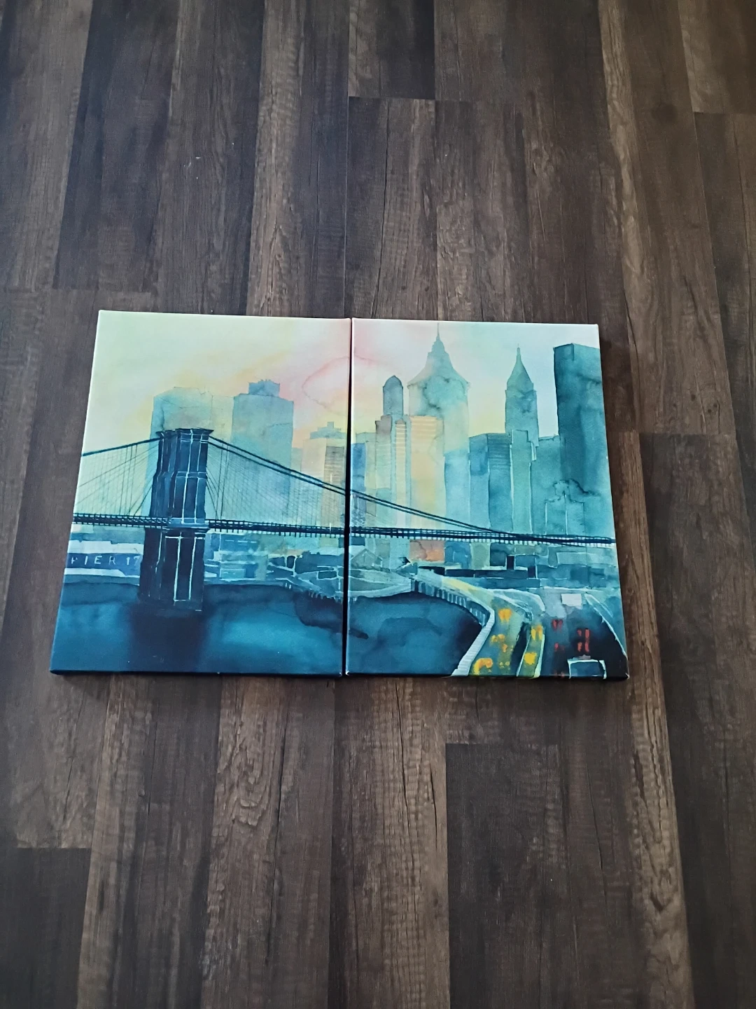 Selling a two-piece canvas wall art set featuring a watercolor-style depiction of New York City. The artwork showcases the Brooklyn Bridge and the city skyline in shades of blue, yellow, and white. They're ready to hang and would look great in any room.... Dimensions 10" x 14"