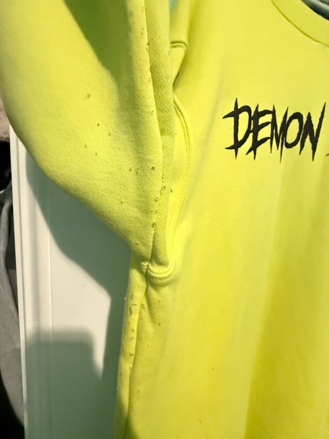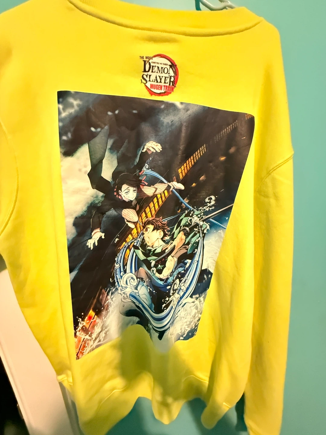 This bright yellow crewneck sweatshirt features "Demon Slayer" graphics on the front and a "Mugen Train" anime scene on the back. The left sleeve has Japanese characters. It's a size 2XL. Some minor pilling is visible on the sleeves.