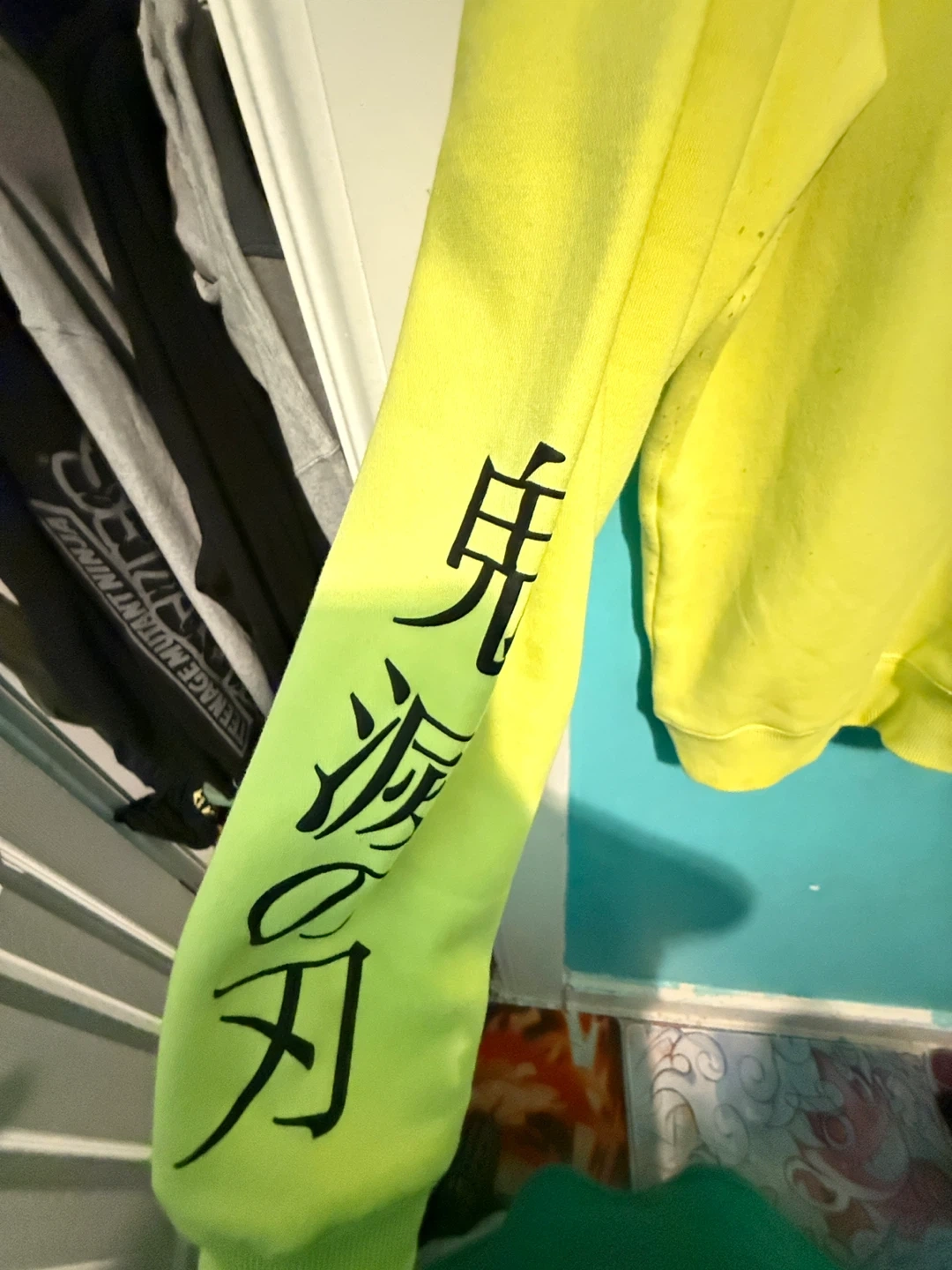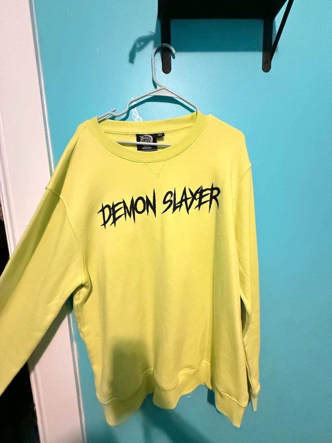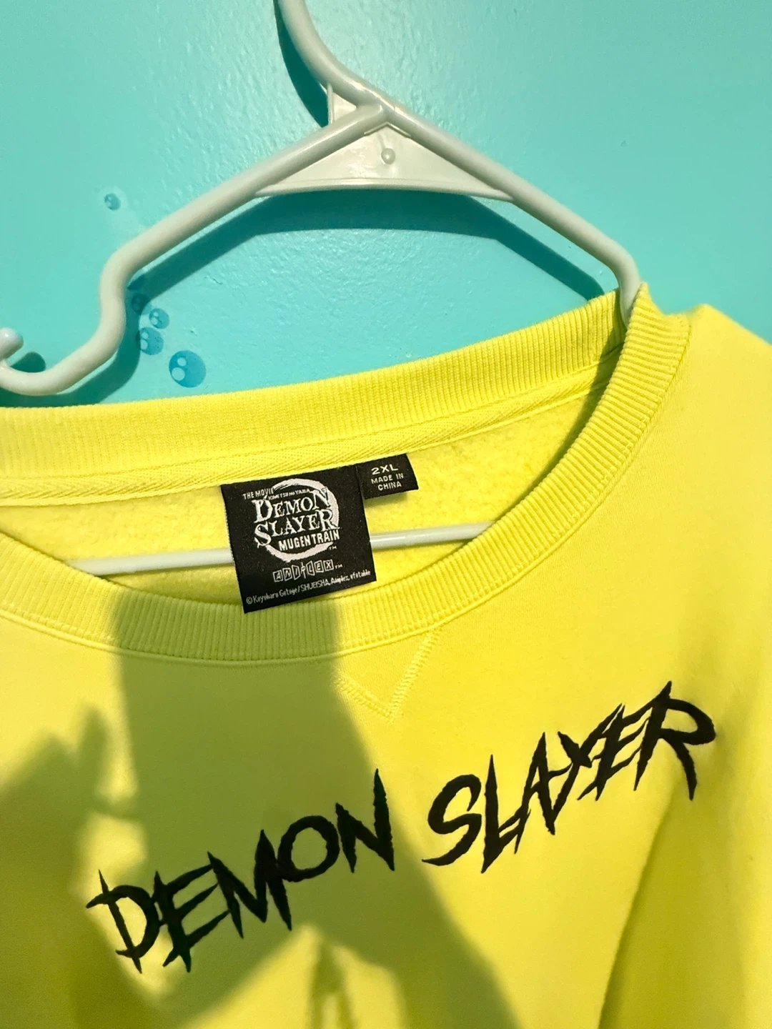 This bright yellow crewneck sweatshirt features "Demon Slayer" graphics on the front and a "Mugen Train" anime scene on the back. The left sleeve has Japanese characters. It's a size 2XL. Some minor pilling is visible on the sleeves.