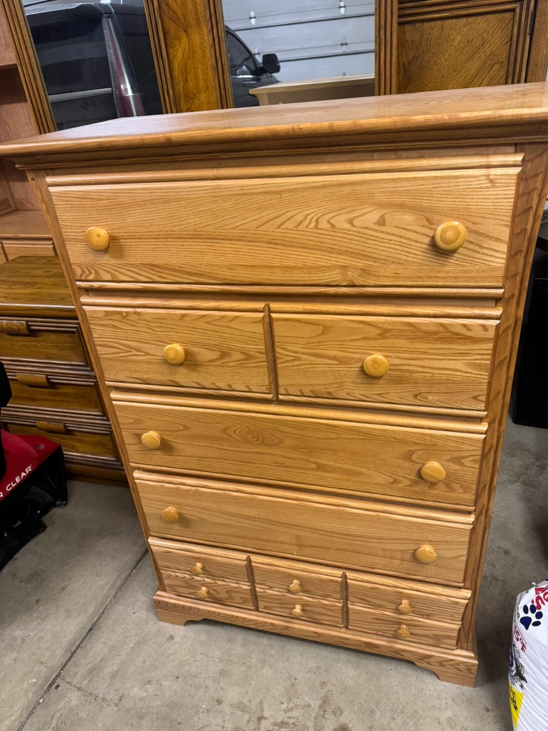 This is a six-drawer wooden dresser. It's made of light-colored wood with round wooden knobs. It has a classic design with a top section and a lower section with smaller drawers. It's a great piece for bedroom storage!