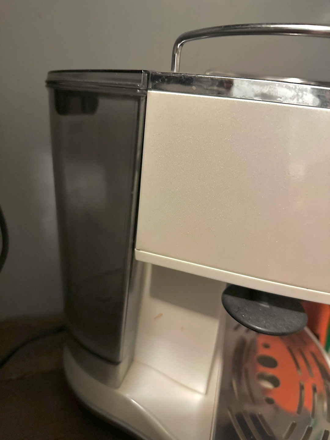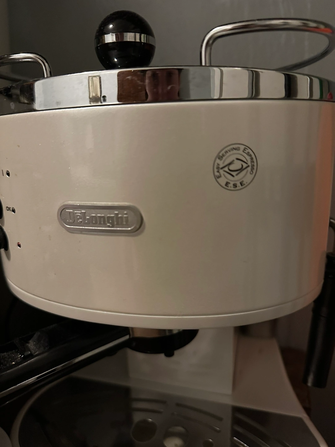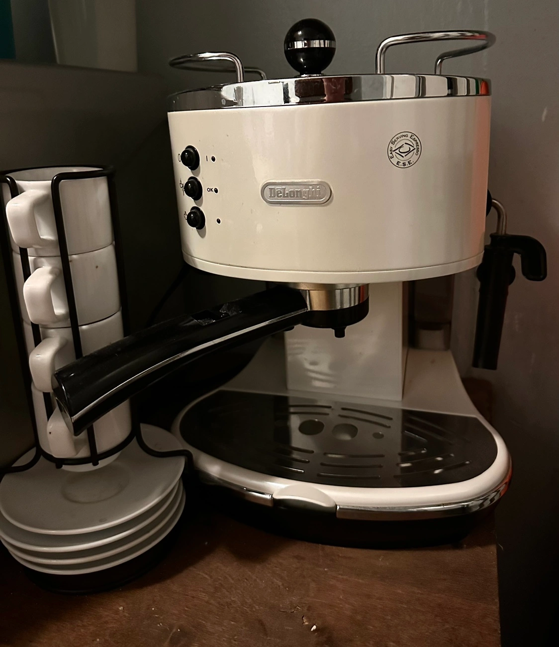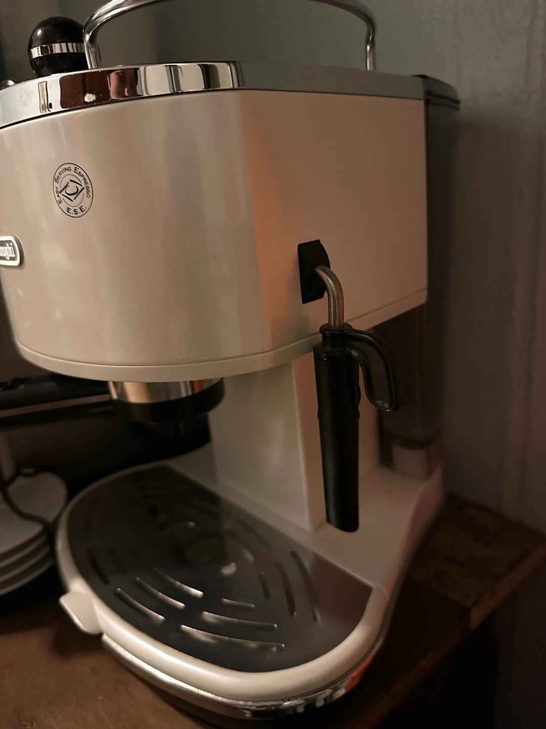 DeLonghi Icona Vintage Espresso Machine and tools for making cappuccino and froths/foam for coffees.