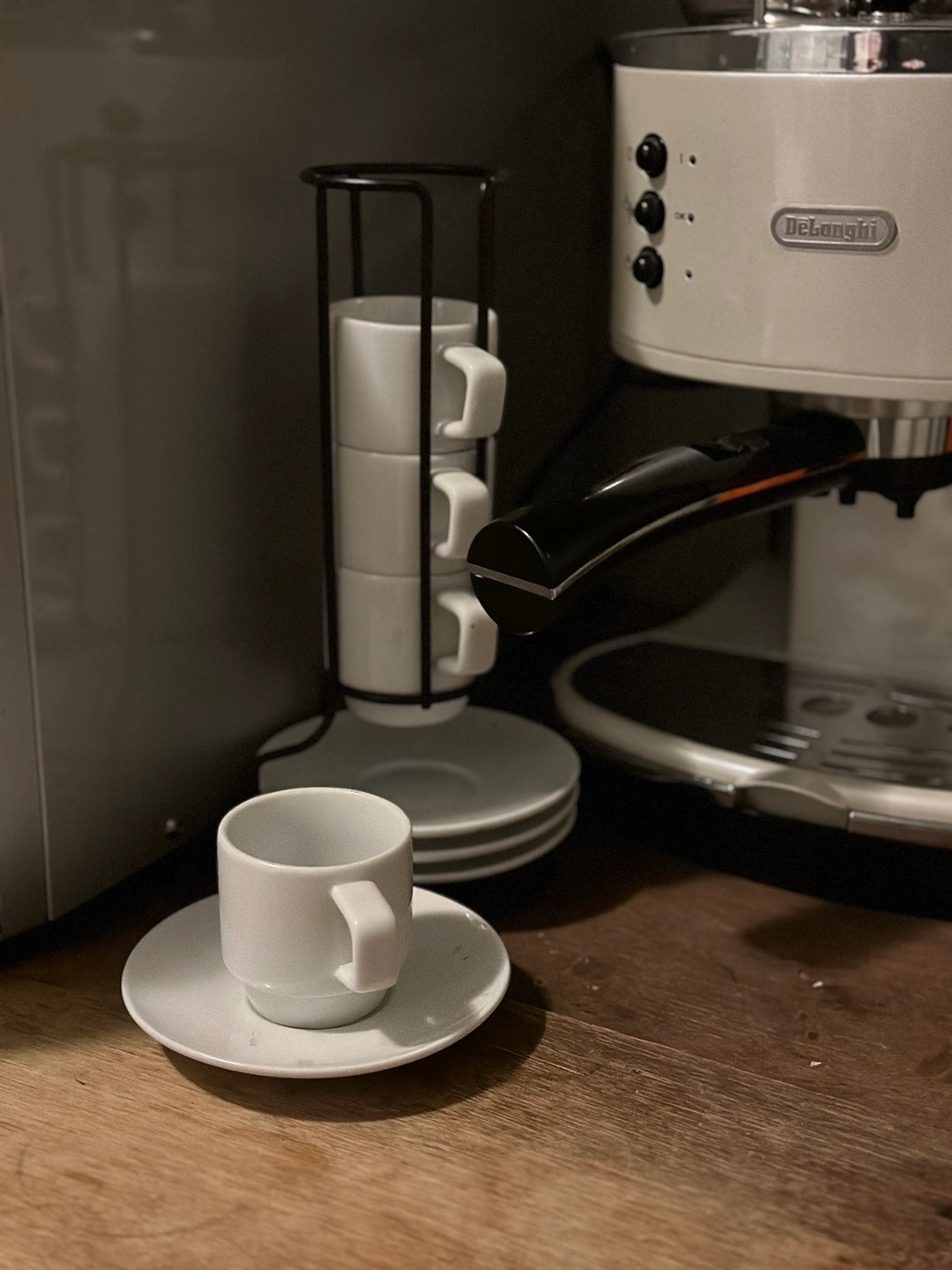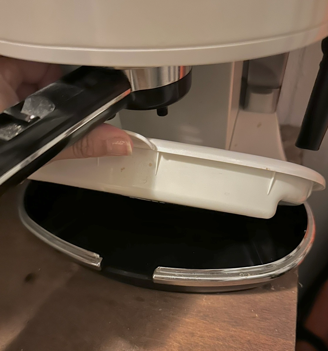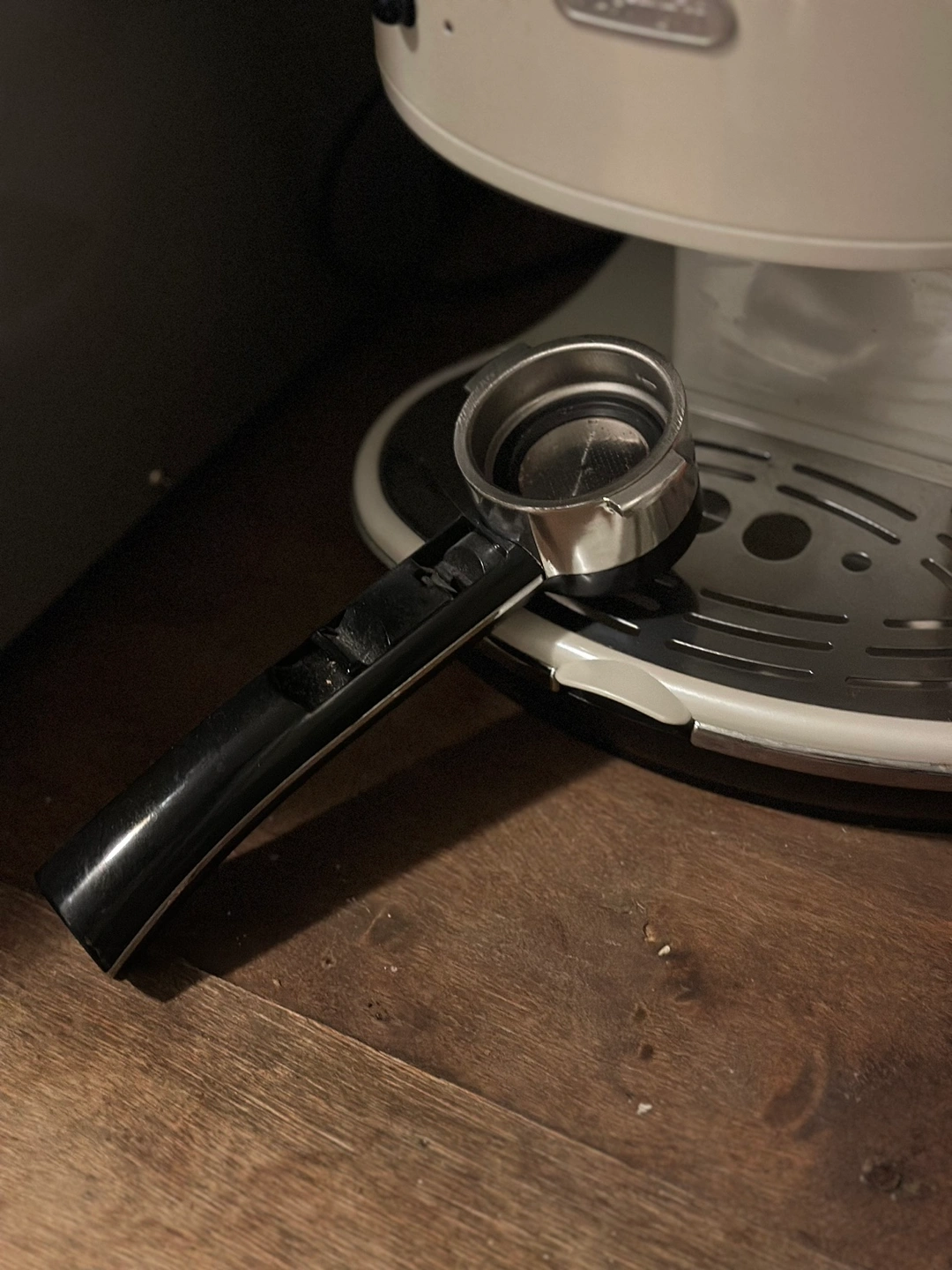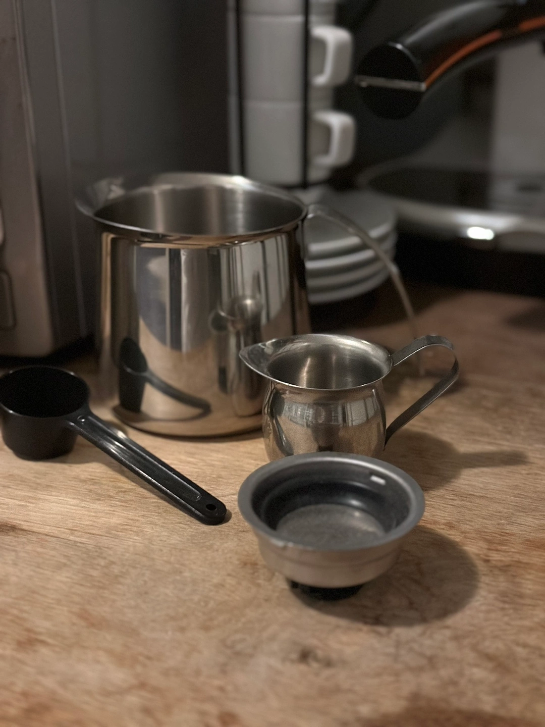 DeLonghi Icona Vintage Espresso Machine and tools for making cappuccino and froths/foam for coffees.