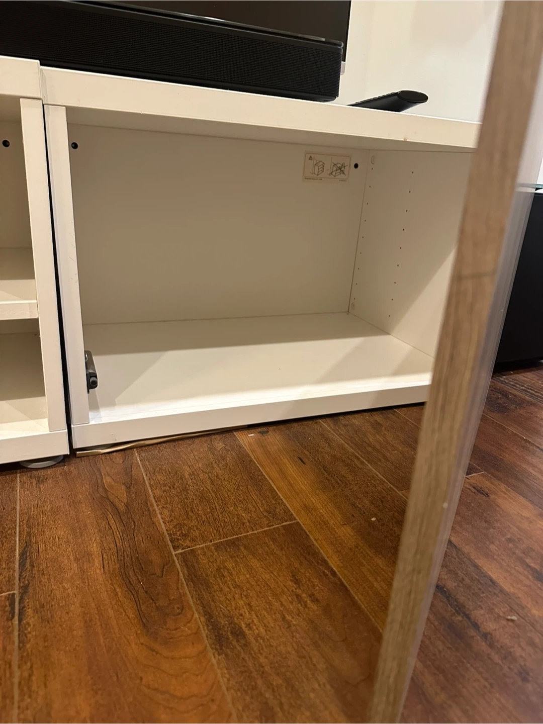 Selling a TV stand with storage. It features a white frame with light wood-look doors. It has open shelving in the center for media components or decor.