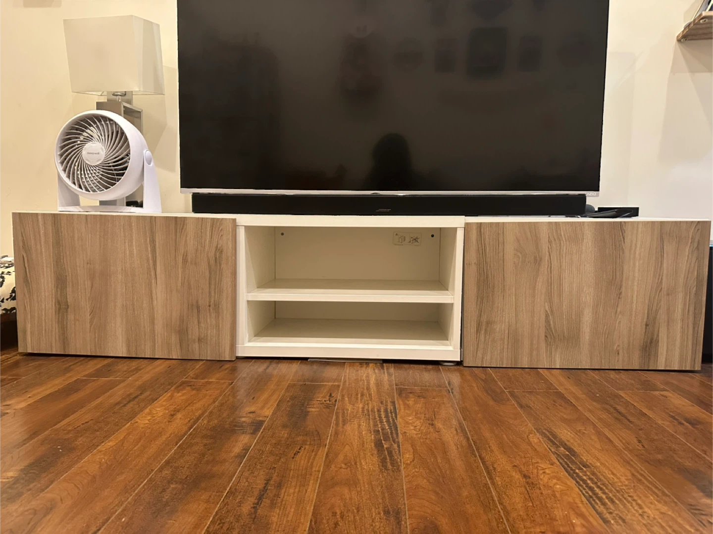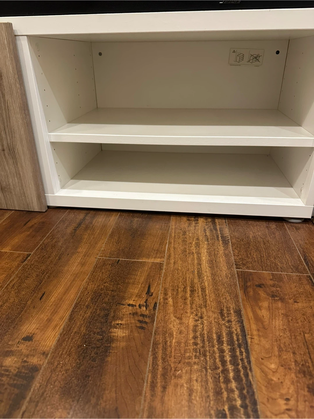 Selling a TV stand with storage. It features a white frame with light wood-look doors. It has open shelving in the center for media components or decor.