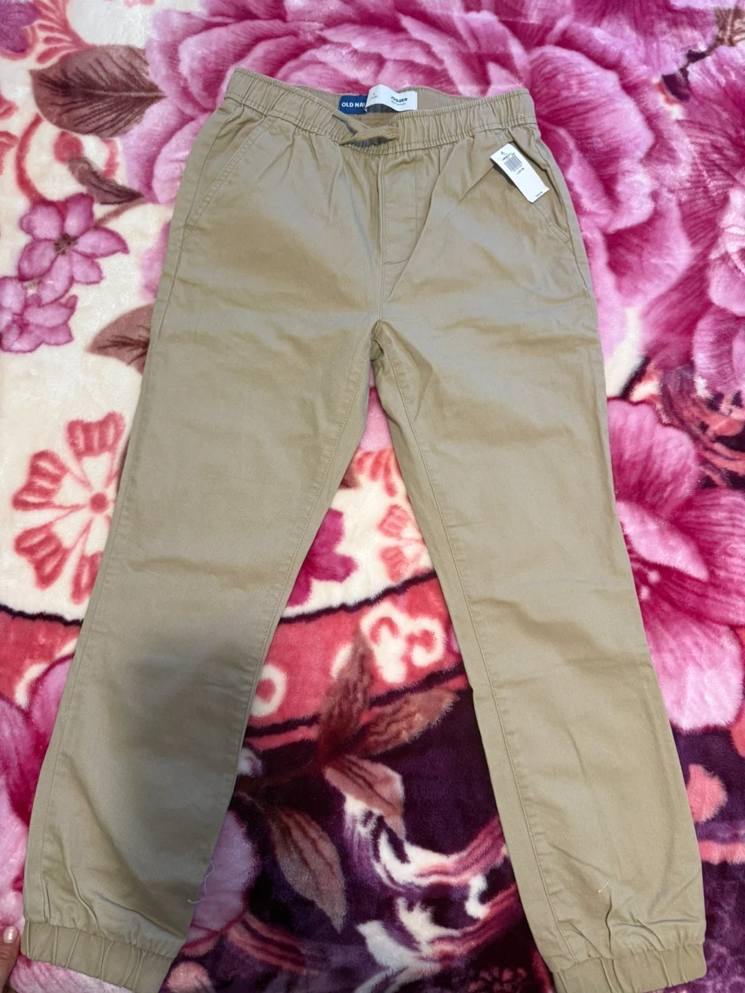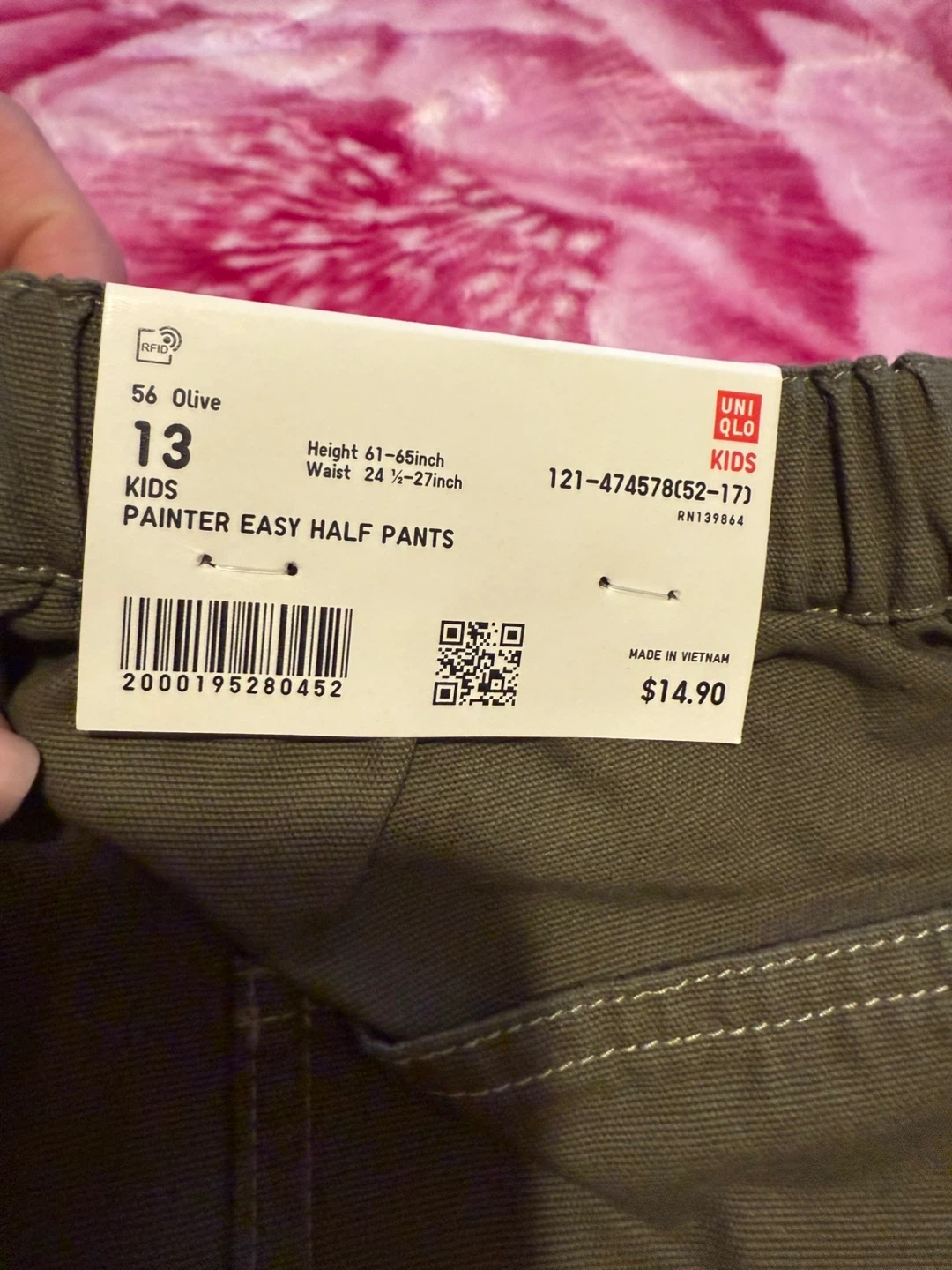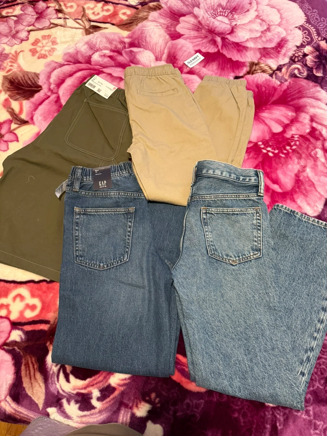 Bundle includes GAP denim jeans in size 14, Old Navy chinos in size L (10-12), and UNI QLO KIDS painter pants in size 13. All items are boys' bottoms.