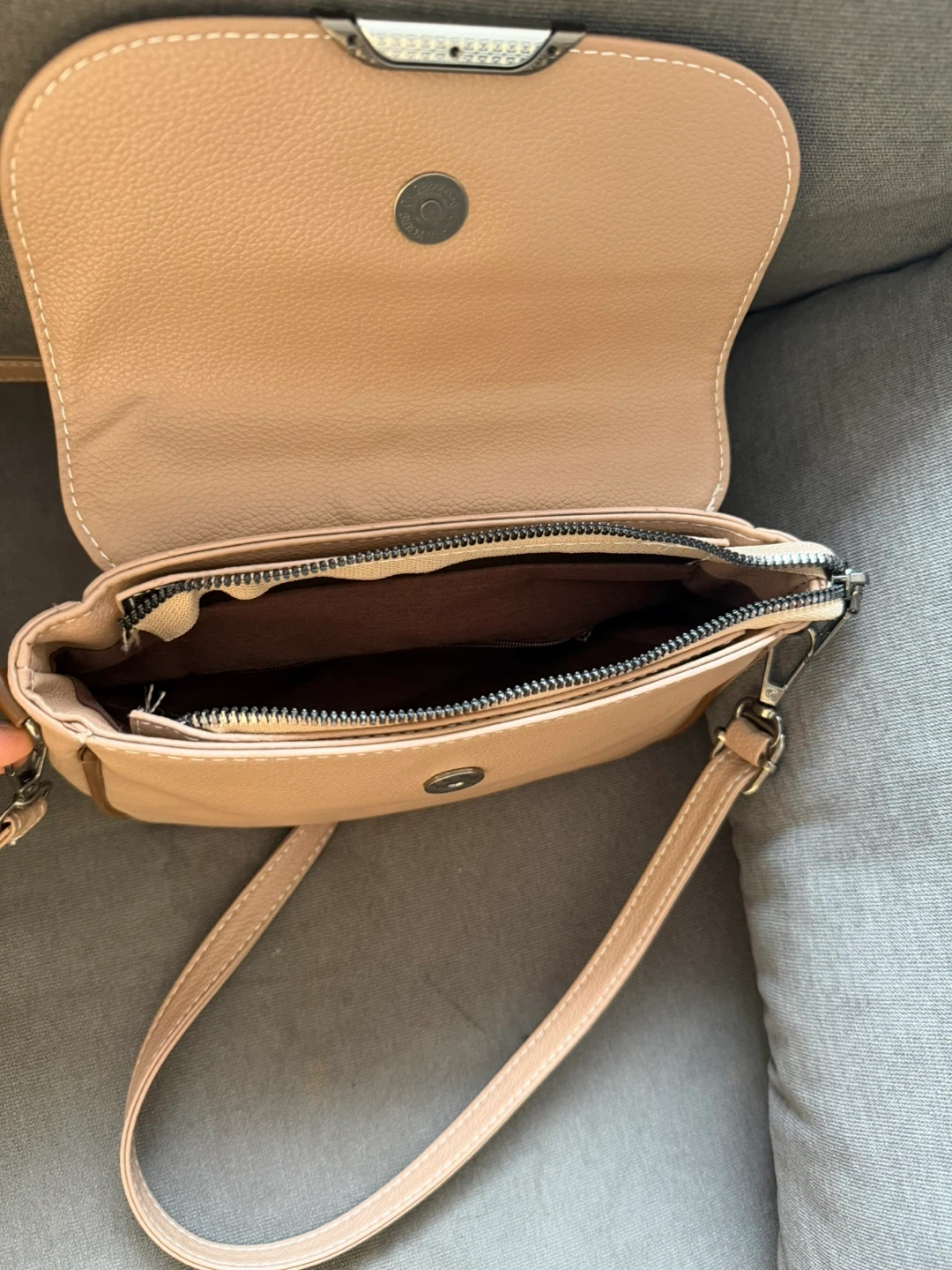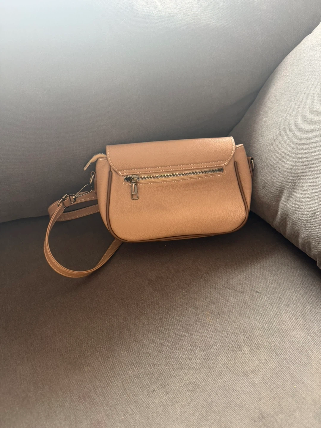 This is a light brown faux leather crossbody bag. It features a fold-over top with a magnetic snap closure. It also has a zippered main compartment and a zippered pocket on the back.