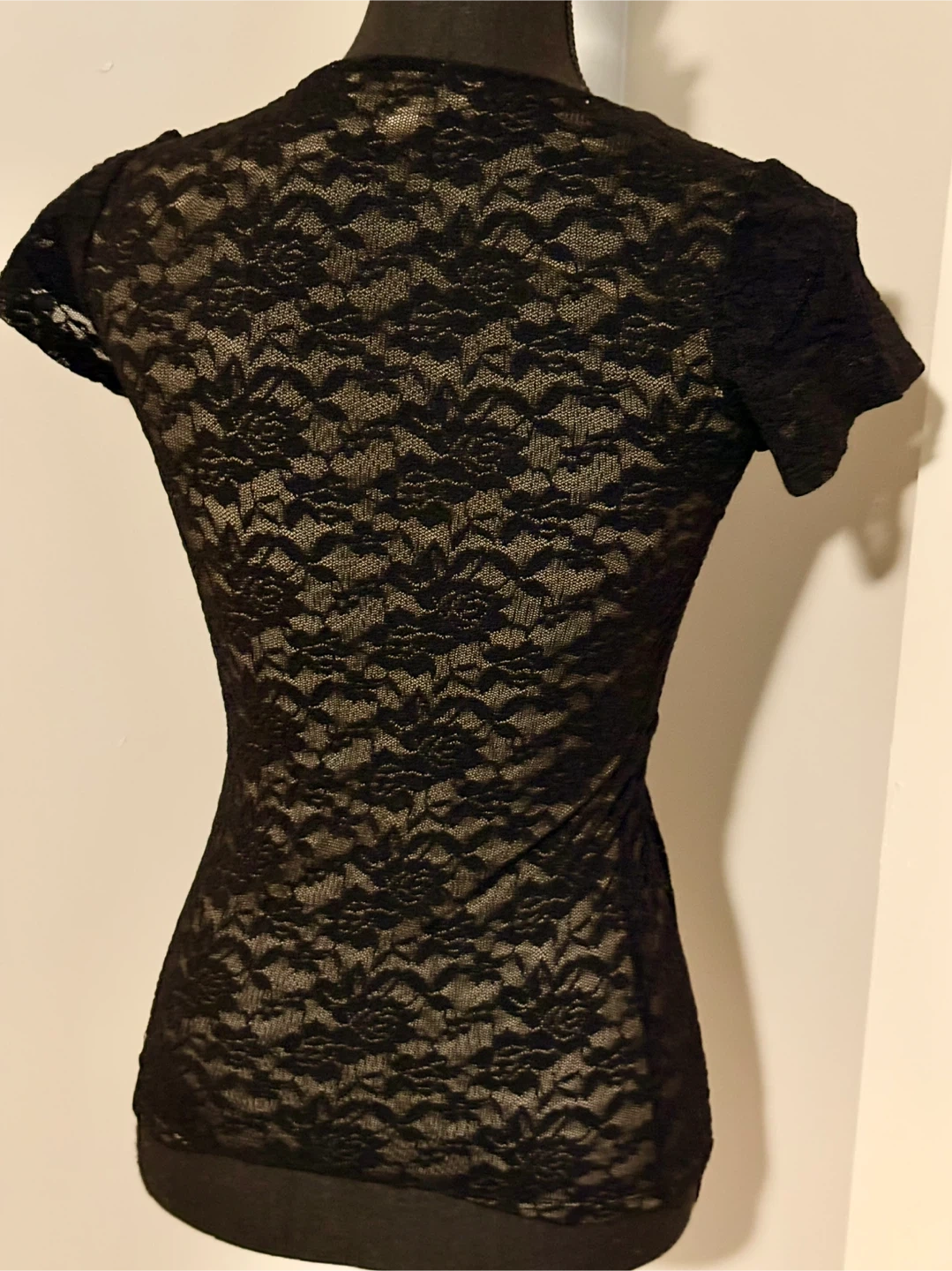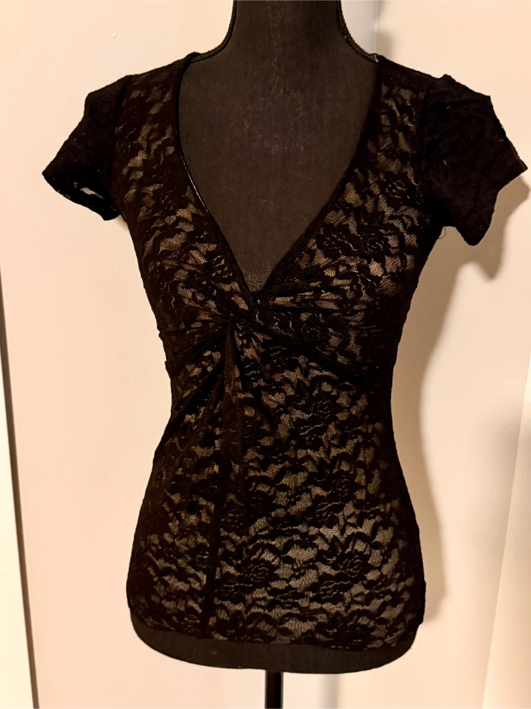 65Selling a cute Cabi black lace top in size XS! It's in great condition and features a flattering V-neck design. Perfect for layering or wearing on its own! Smoke free pet friendly home 🐾