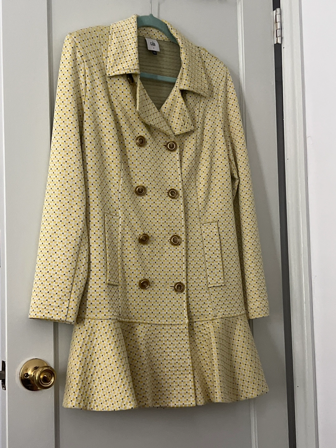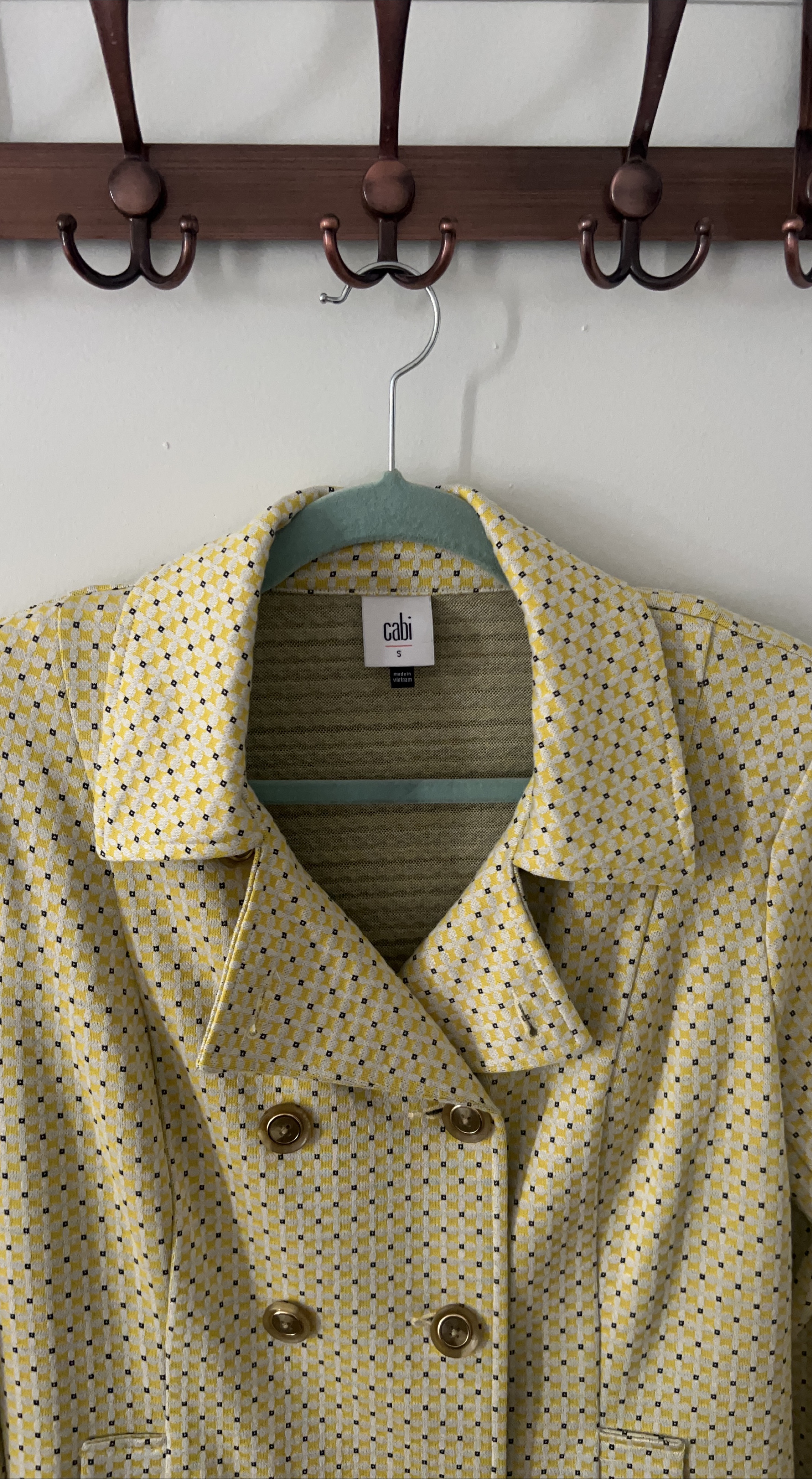 Selling a Cabi women's blazer in size small. It features a unique yellow patterned design and a double-breasted style with gold buttons. This blazer is perfect for adding a pop of color and sophistication to your wardrobe! The material is comfortable and the fit is flattering. It can also be worn as a dress and belted!!