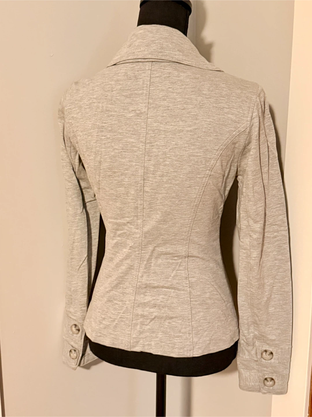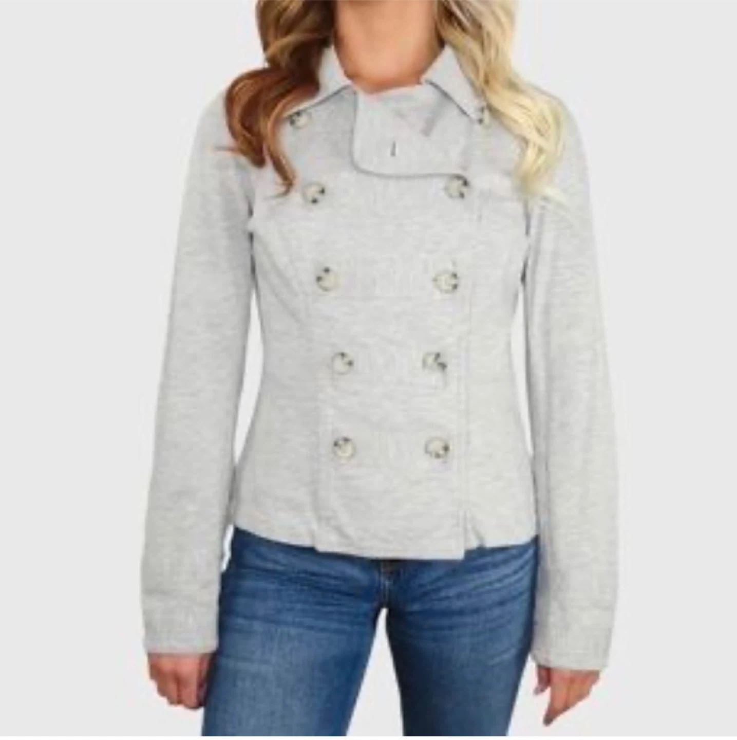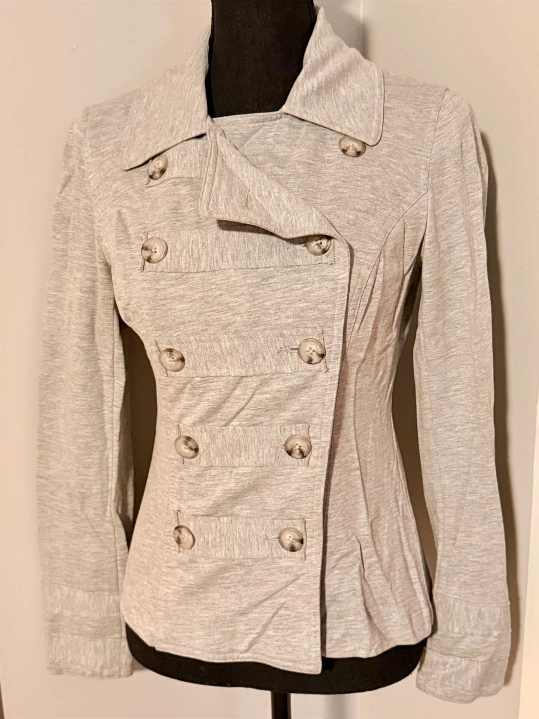 65Chic gray double-breasted jacket with button details. Perfect for any occasion. Heather gray Button up front Raw hem detailing on front Long sleeves Military style detailing Princess seaming for fitted look Soft stretchy sweatshirt feel material Excellent condition, like new! Smoke free dog friendly home.