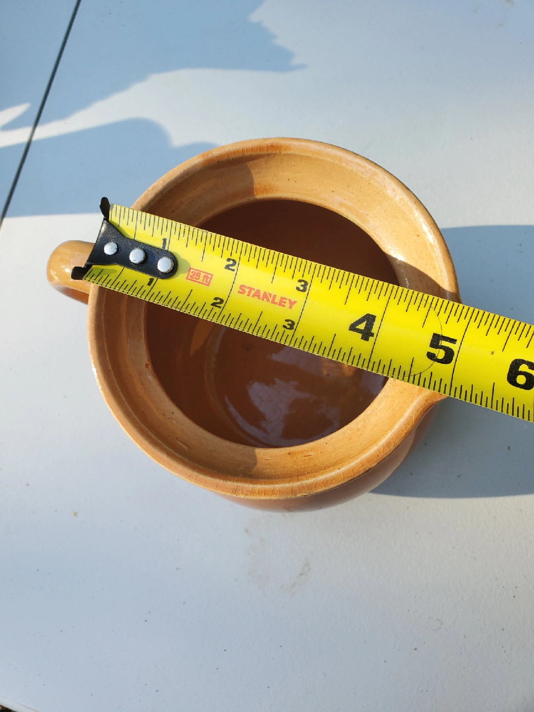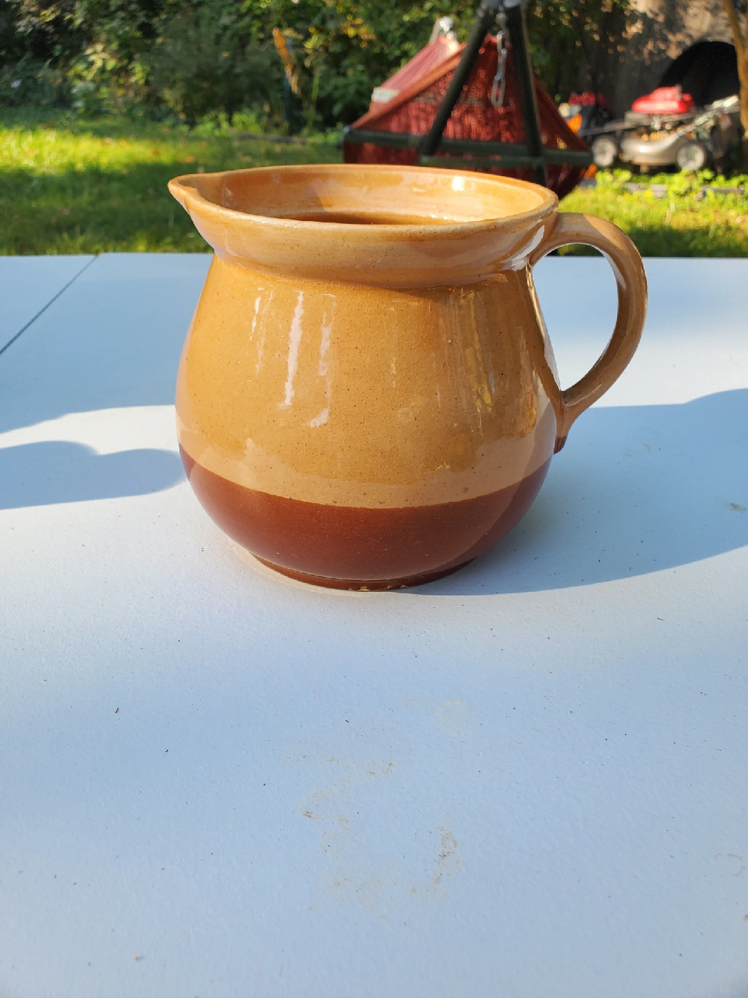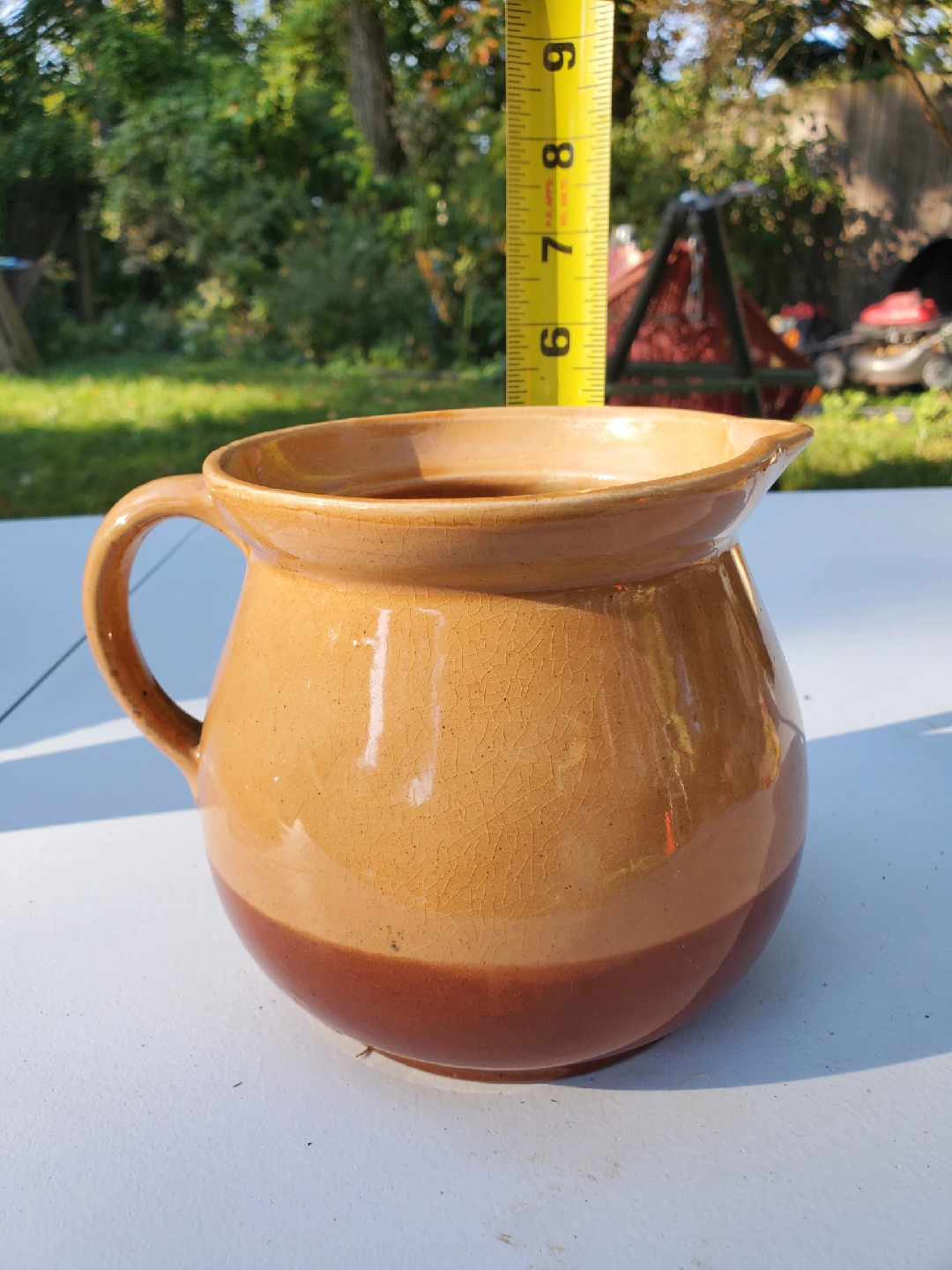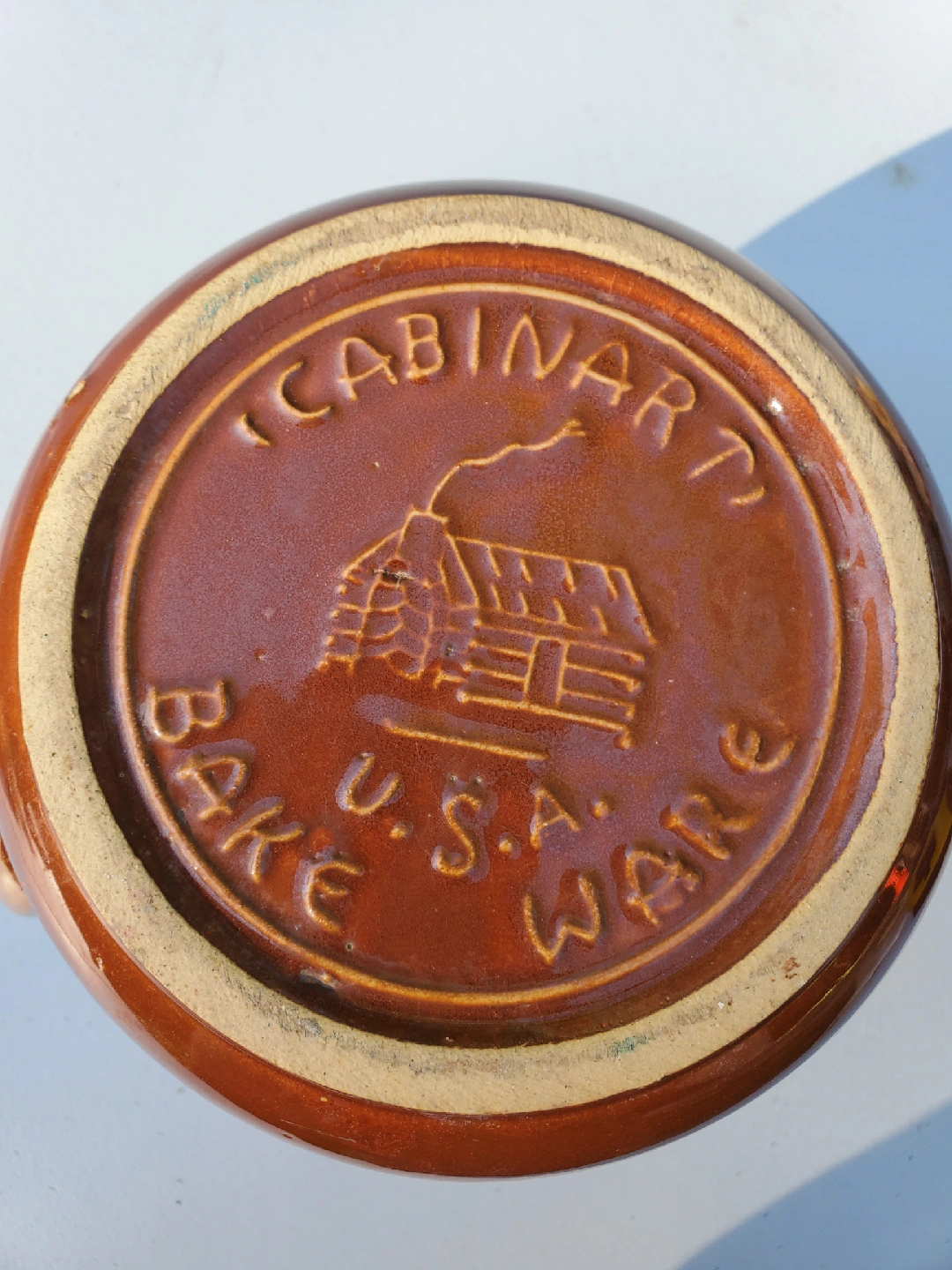60Selling a Cabinart Bake Ware pitcher! It's a charming piece with a two-tone design, featuring a lighter upper half and a darker brown base. The bottom has the Cabinart logo. It measures approximately 5 inches in diameter at the top opening.