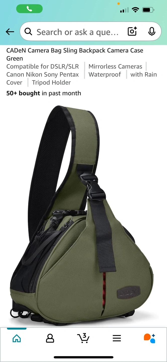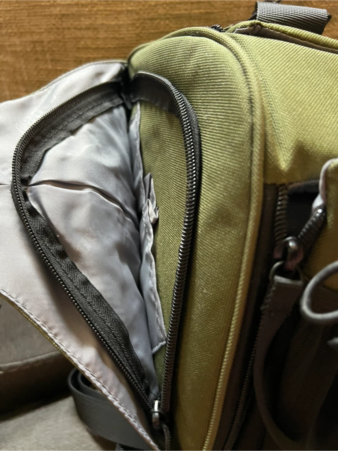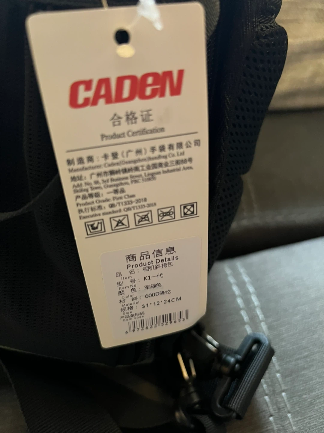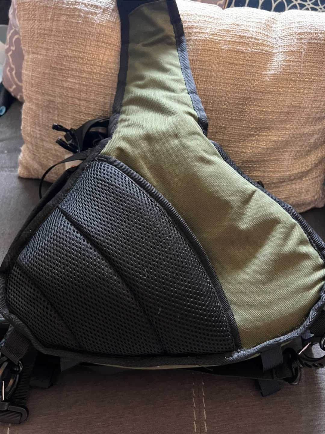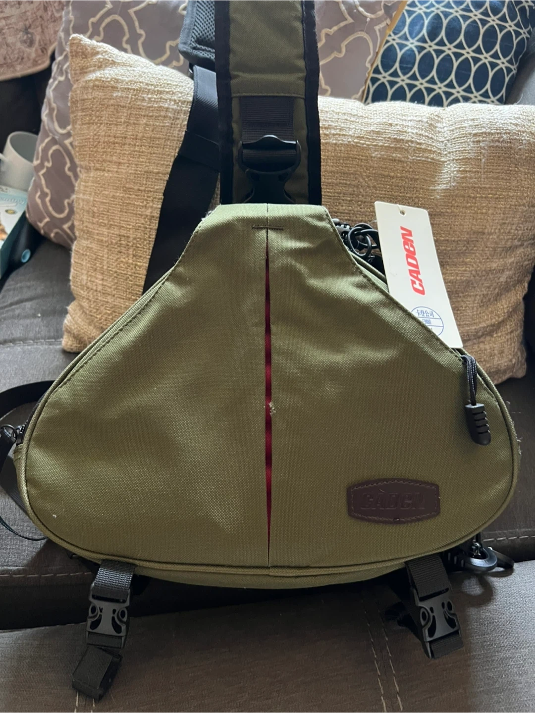 Selling a CADEN K1 sling bag in a nice olive green color. It's made of 600D nylon and measures approximately 31 x 12 x 24 cm. It’s new with one minor flaw on front near pleat. You see it less in person than in the photo. We meant to return it, but forgot.