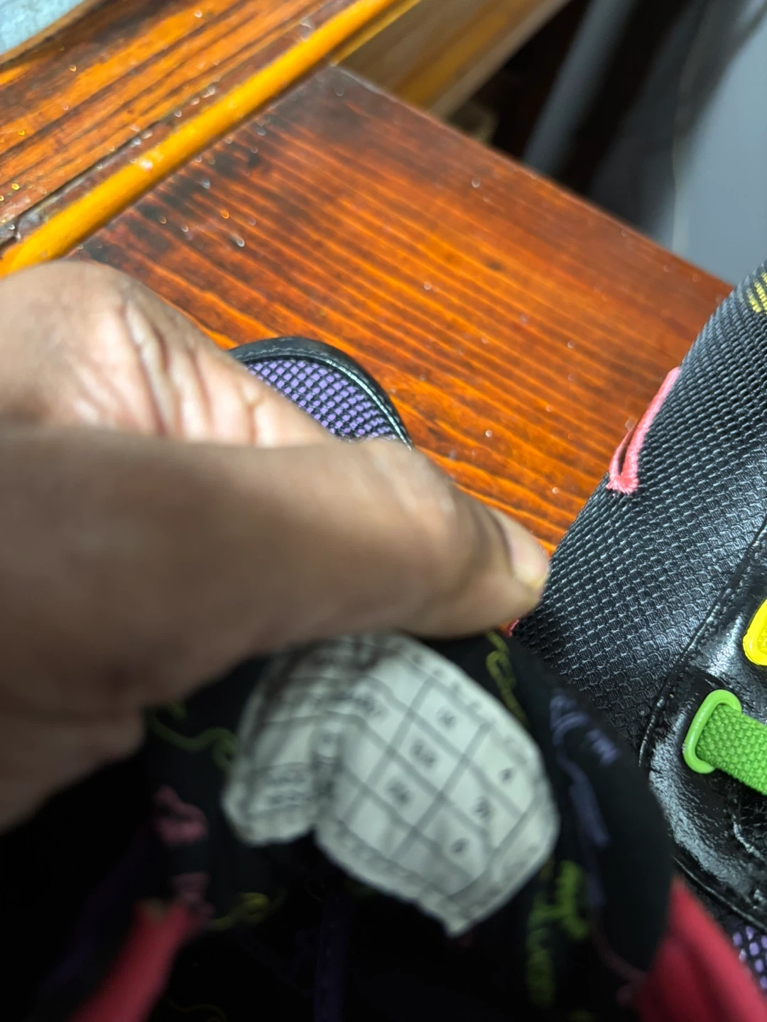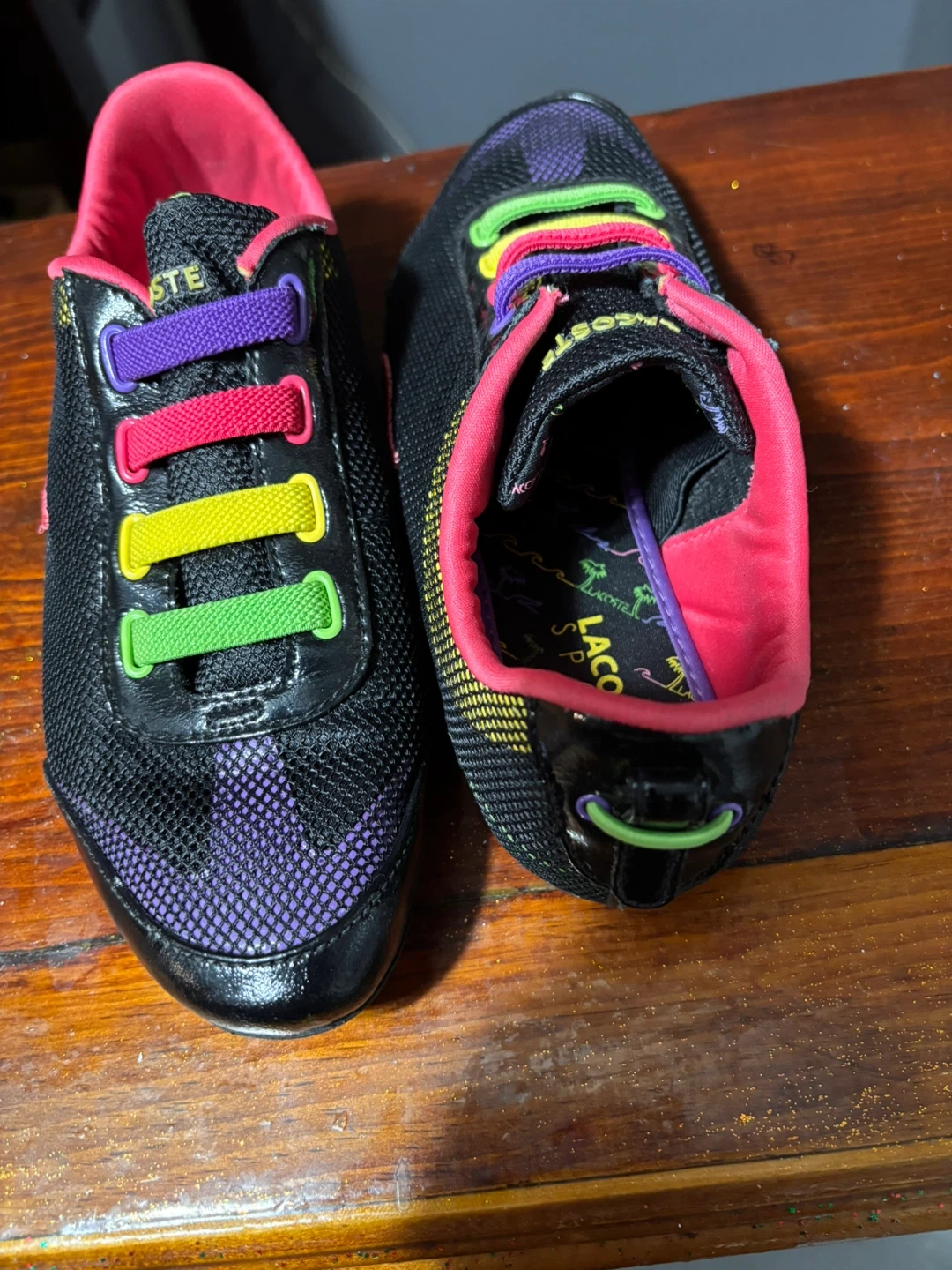 Lacoste Sport sneakers in black with vibrant, multi-colored laces. Features a mesh upper and rubber sole. Great for casual wear!