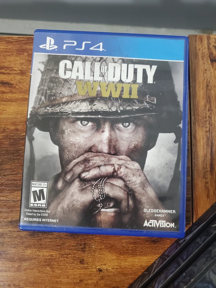 10Selling a used copy of Call of Duty WWII for the PlayStation 4 (PS4). The game is rated Mature 17+ by the ESRB and requires internet for online interactions.