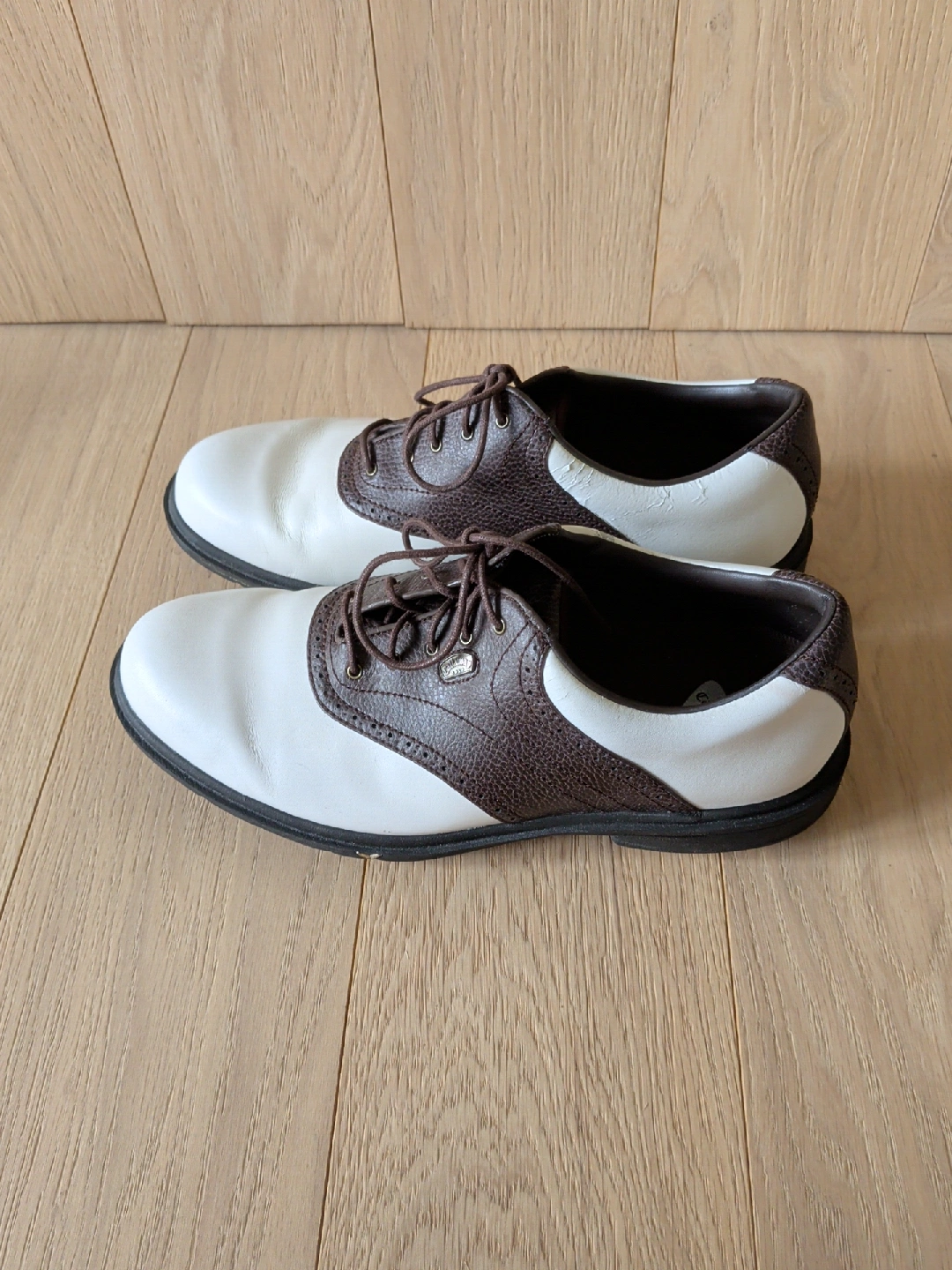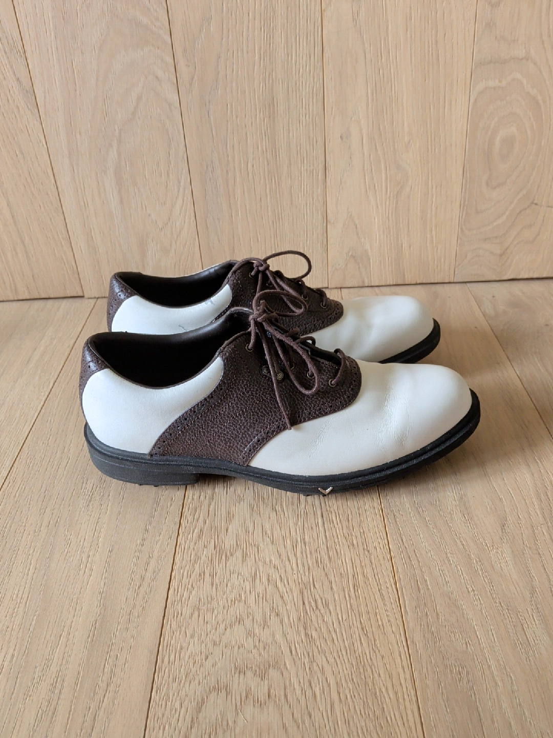 Selling a pair of Callaway golf shoes. They're white and brown with a lace-up closure. Great for hitting the green!