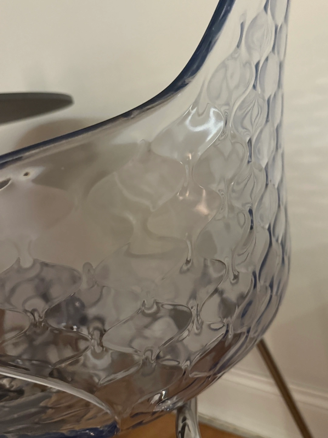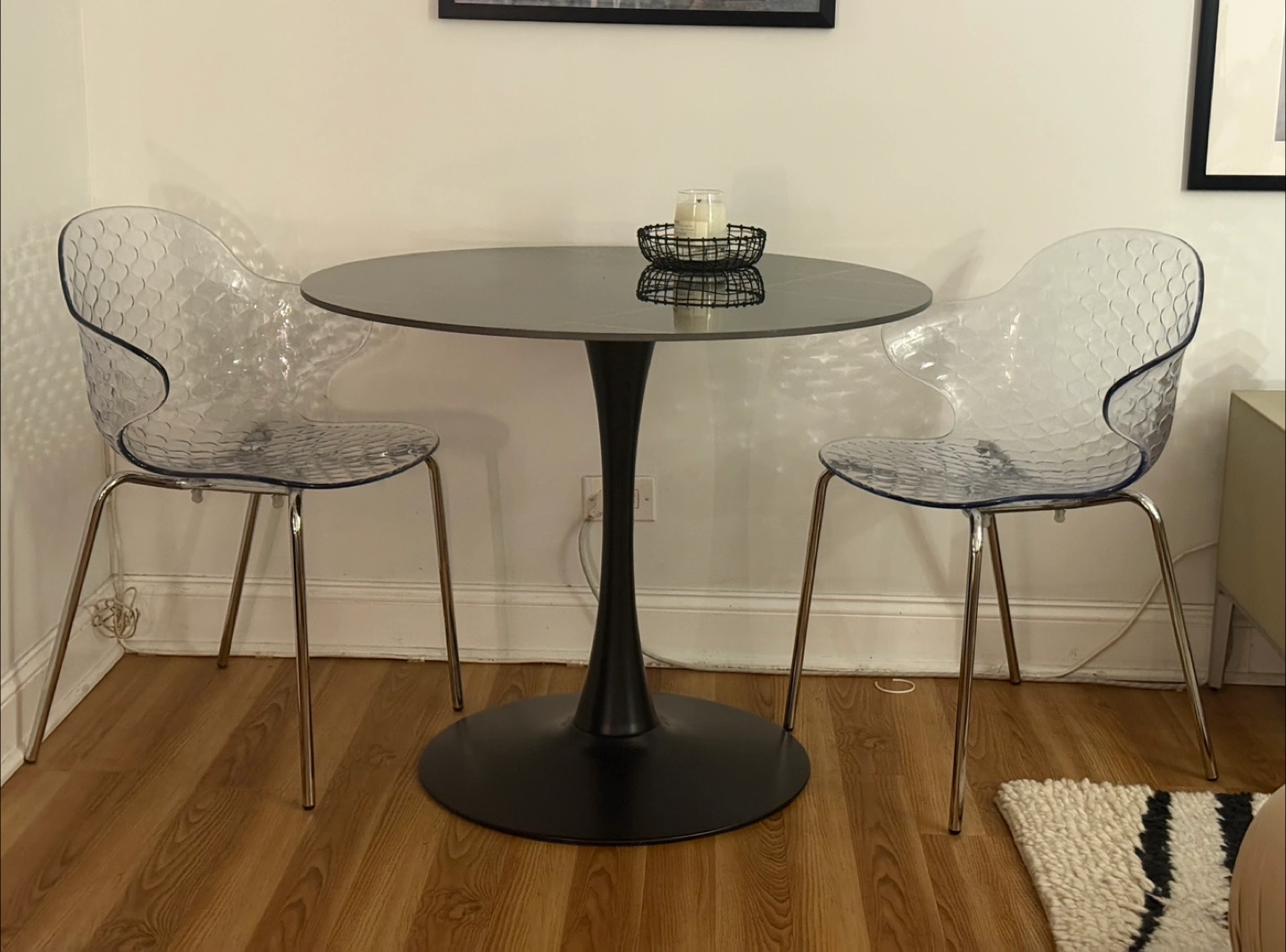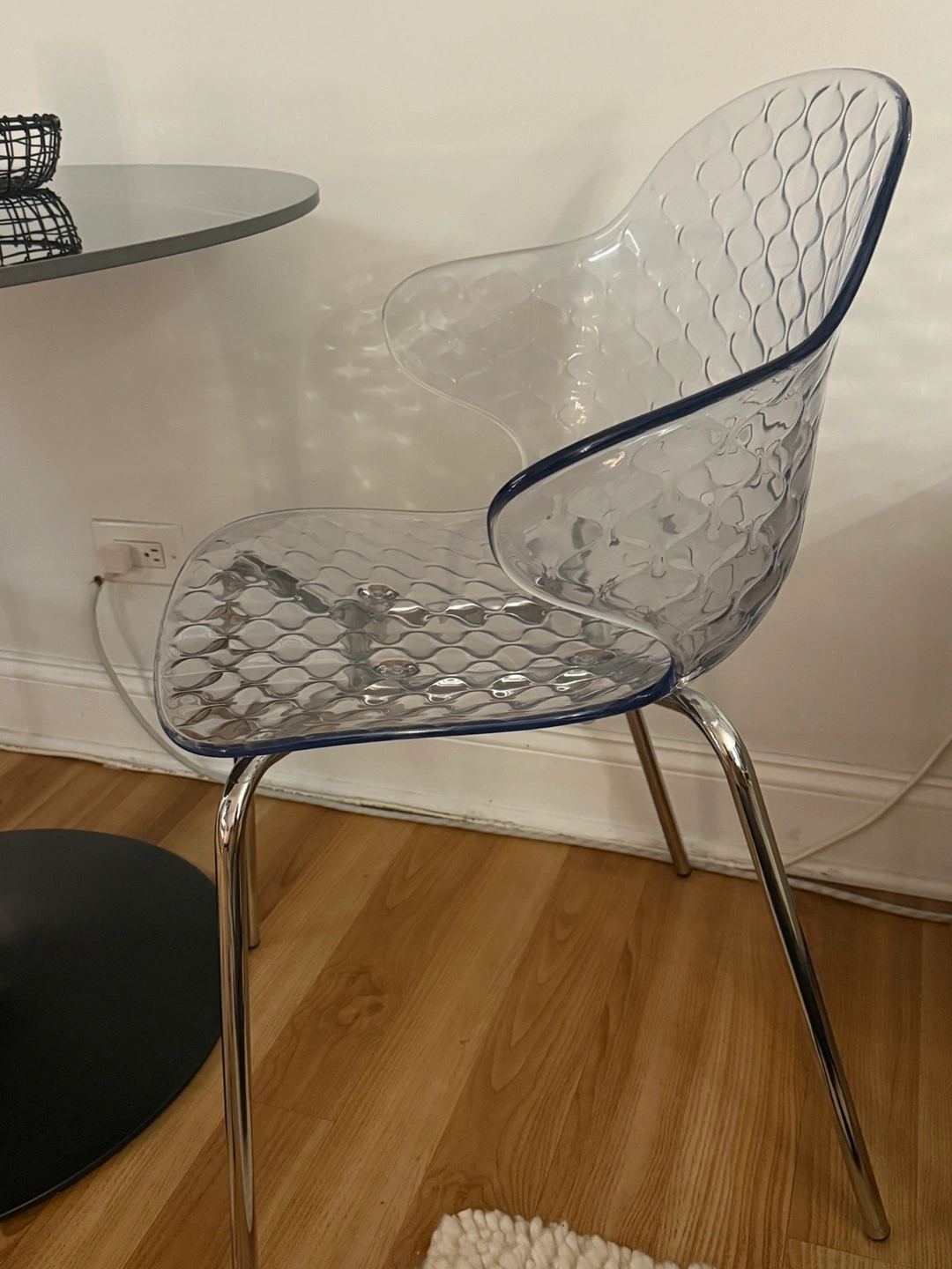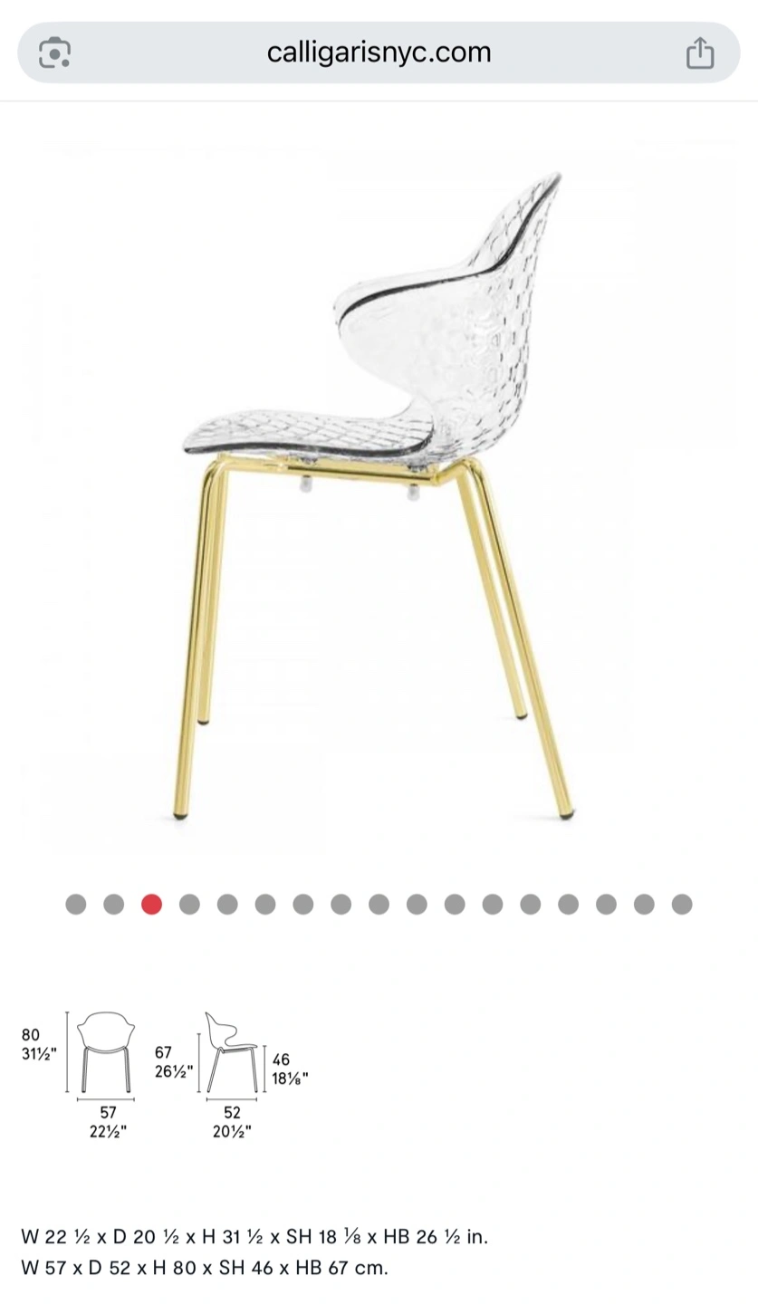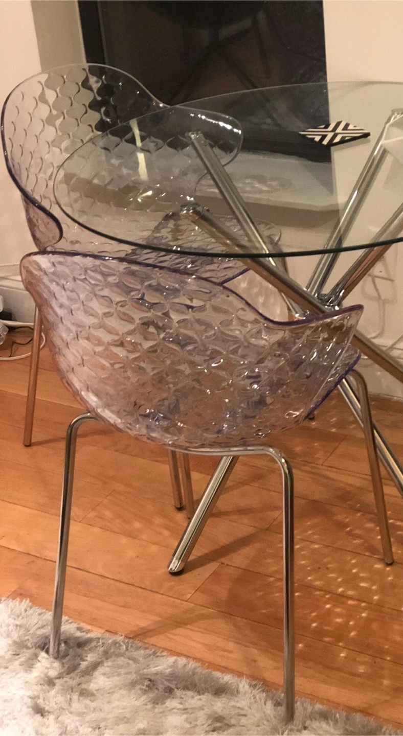 Selling a set of 2 Calligaris dining chairs! It has a transparent, textured design that adds a modern touch to any room. The chairs are in great condition and ready for a new home. It has a clear transparent seat and chrome legs. These will be great for small apartments as they don’t visually take space, while having an interesting shape and are STACKABLE. They are also ideal for a house with pets as they don’t scratch easily, and even if they do, the pattern helps with minimizing them. You can buy more new chairs at Calligaris, as they’re still in their collection, if you want to add onto the set - they sell for $429 each ($858 for 2).