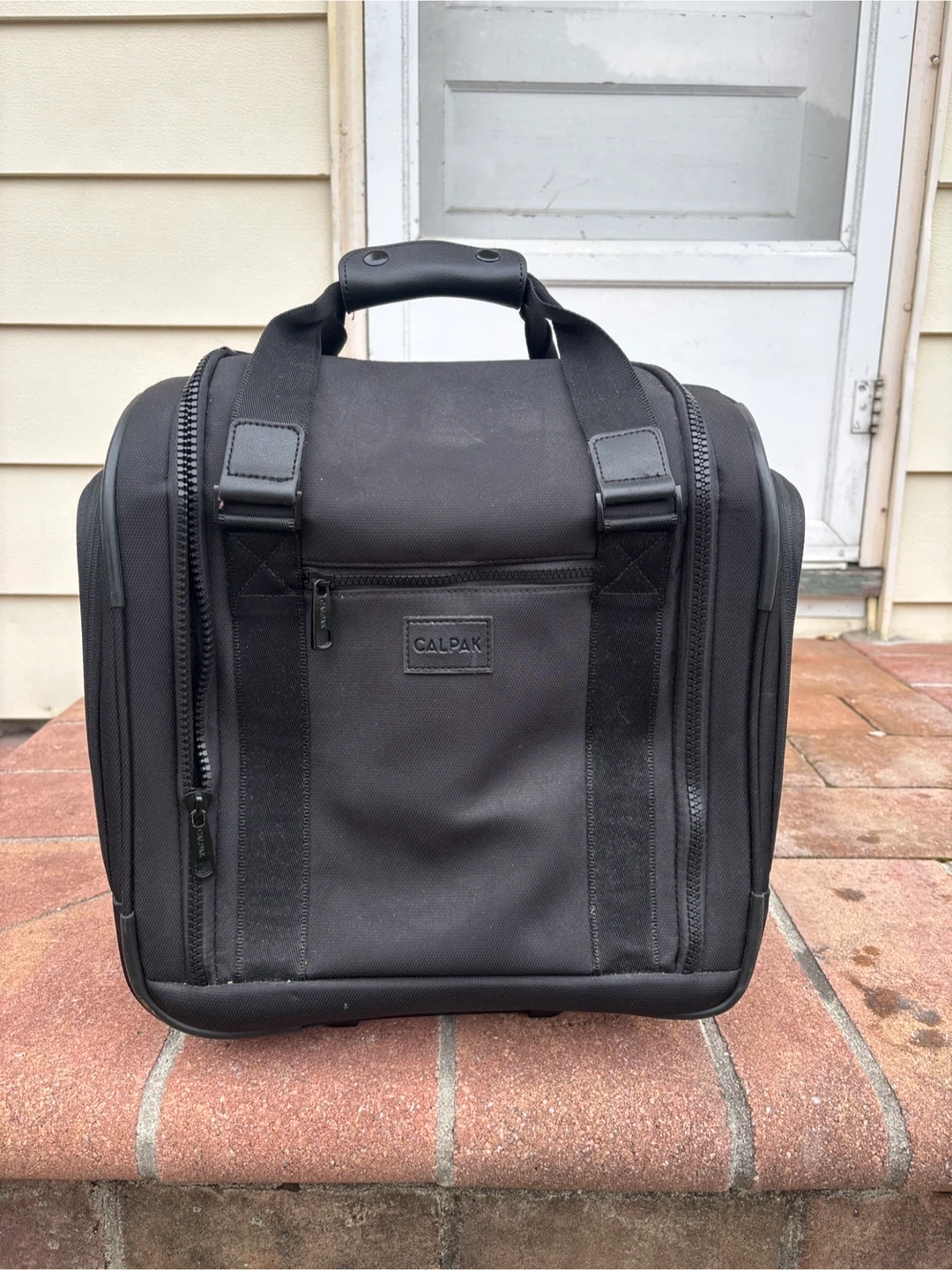 Selling a Calpak rolling carry-on luggage in black! It's in great condition and ready for your next trip. Perfect for keeping your essentials organized and easily accessible while traveling