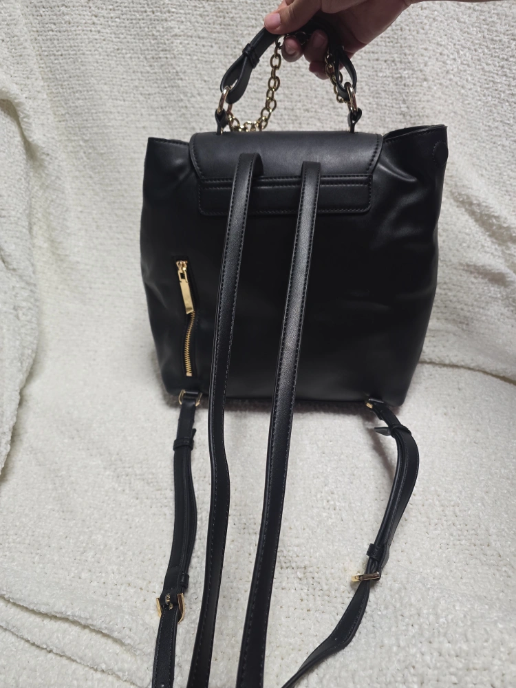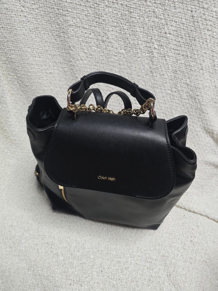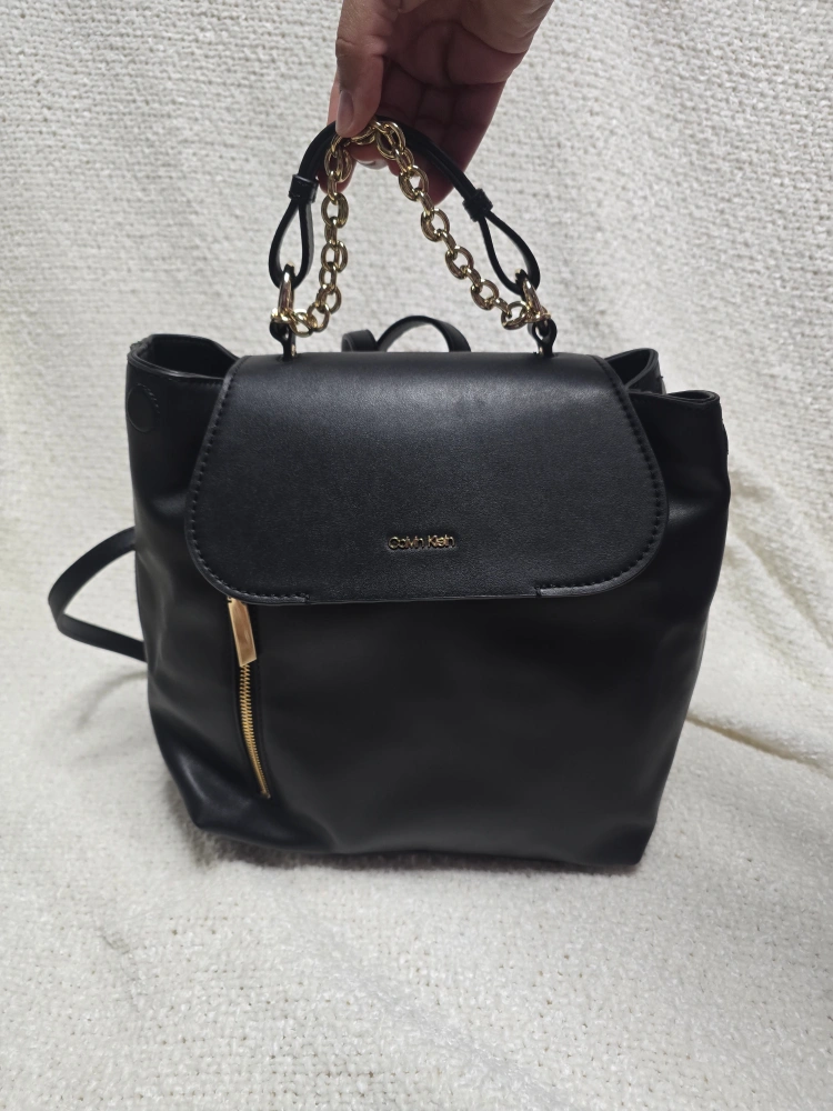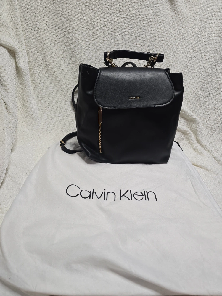 This is a Calvin Klein black backpack. It features a gold chain detail on the handle and a front zipper. and comes with the original dust bag!