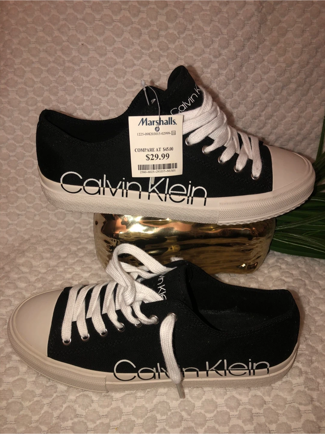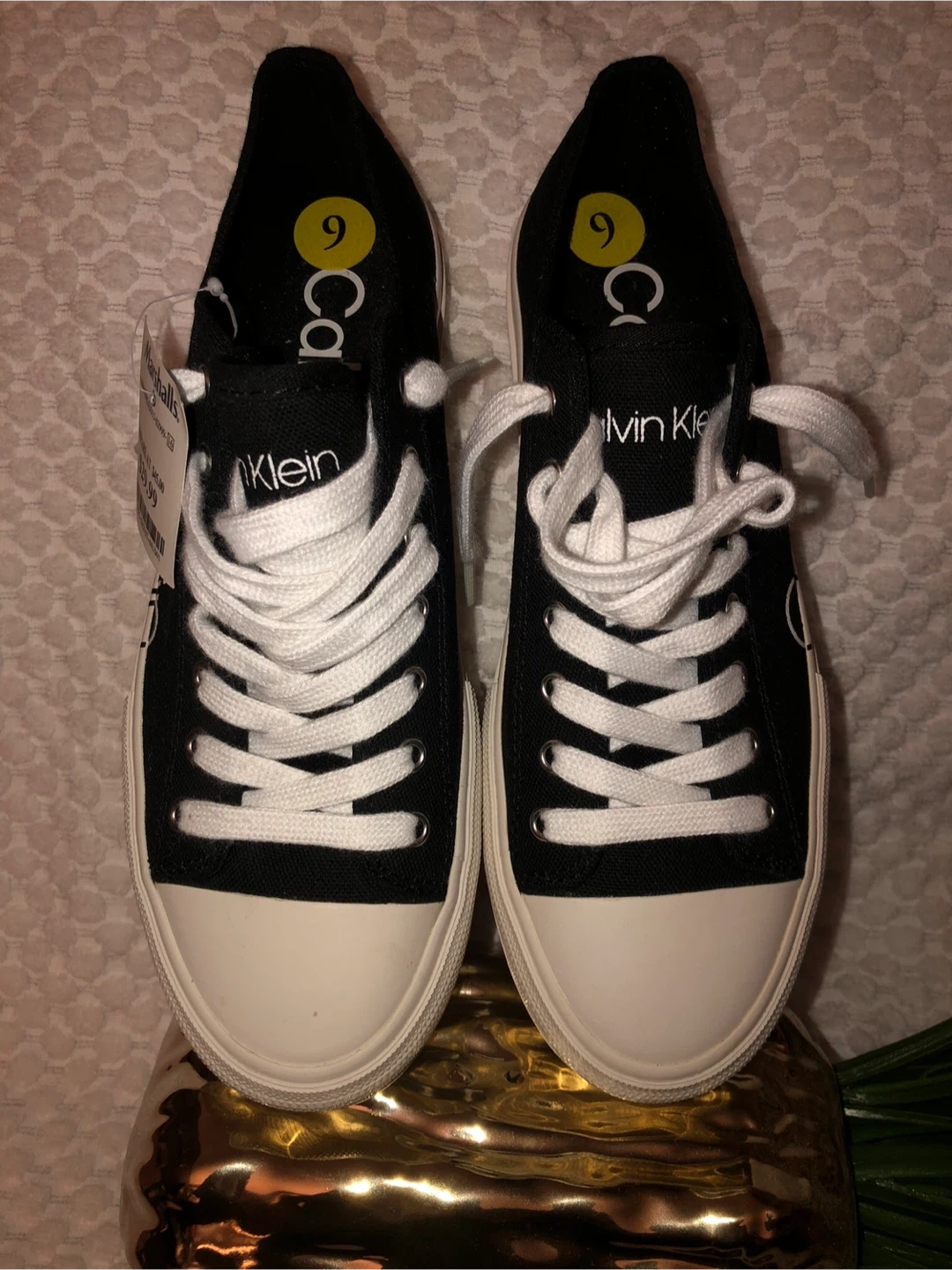 15These are a pair of Calvin Klein canvas sneakers in black and white. They're a size 9 and look to be in great condition! The tag shows they were originally priced at $29.99.