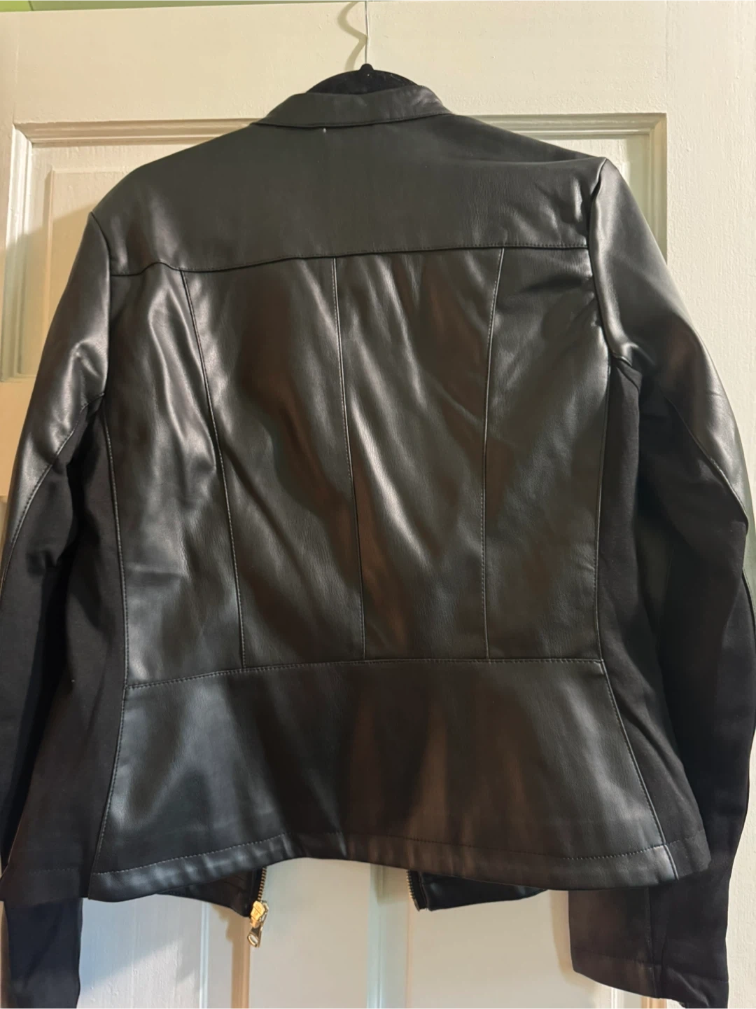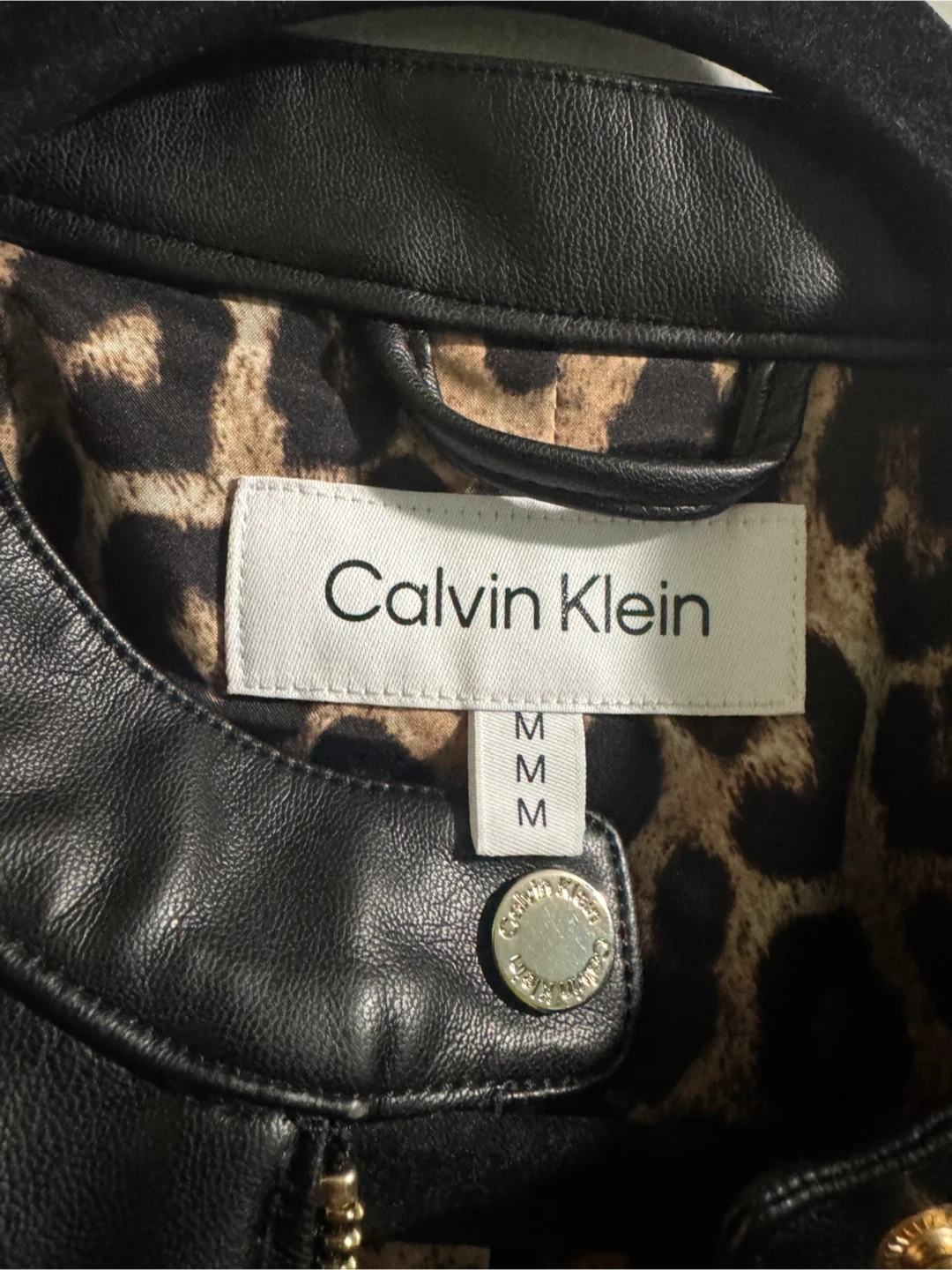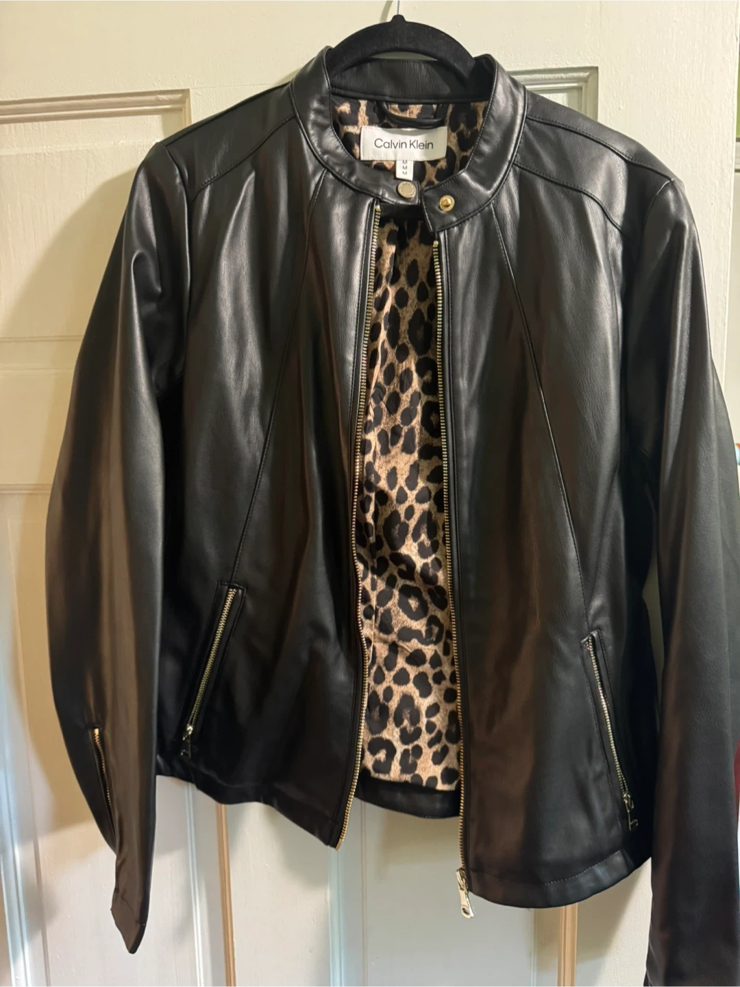 10Selling a Calvin Klein black faux leather jacket in size medium. This stylish jacket features gold zippers and a fun leopard print lining. It's in great condition and ready for a new home!