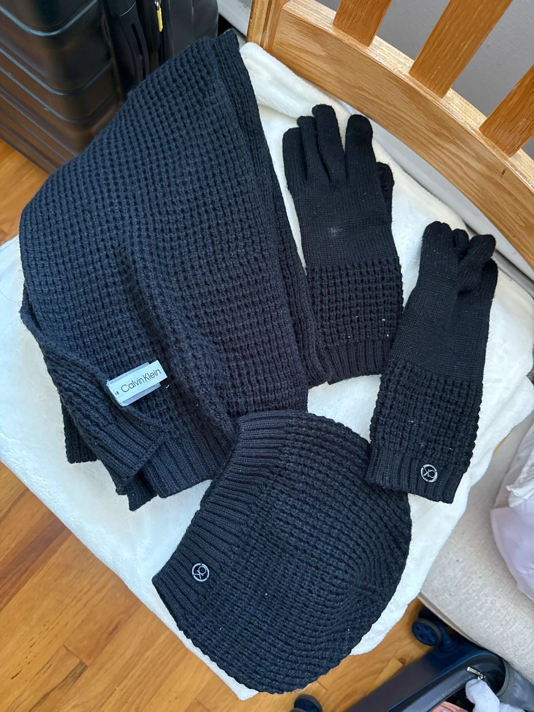 Selling a Calvin Klein matching set! Includes a knit scarf, hat, and pair of gloves, all in black. Perfect for staying warm and stylish this winter!