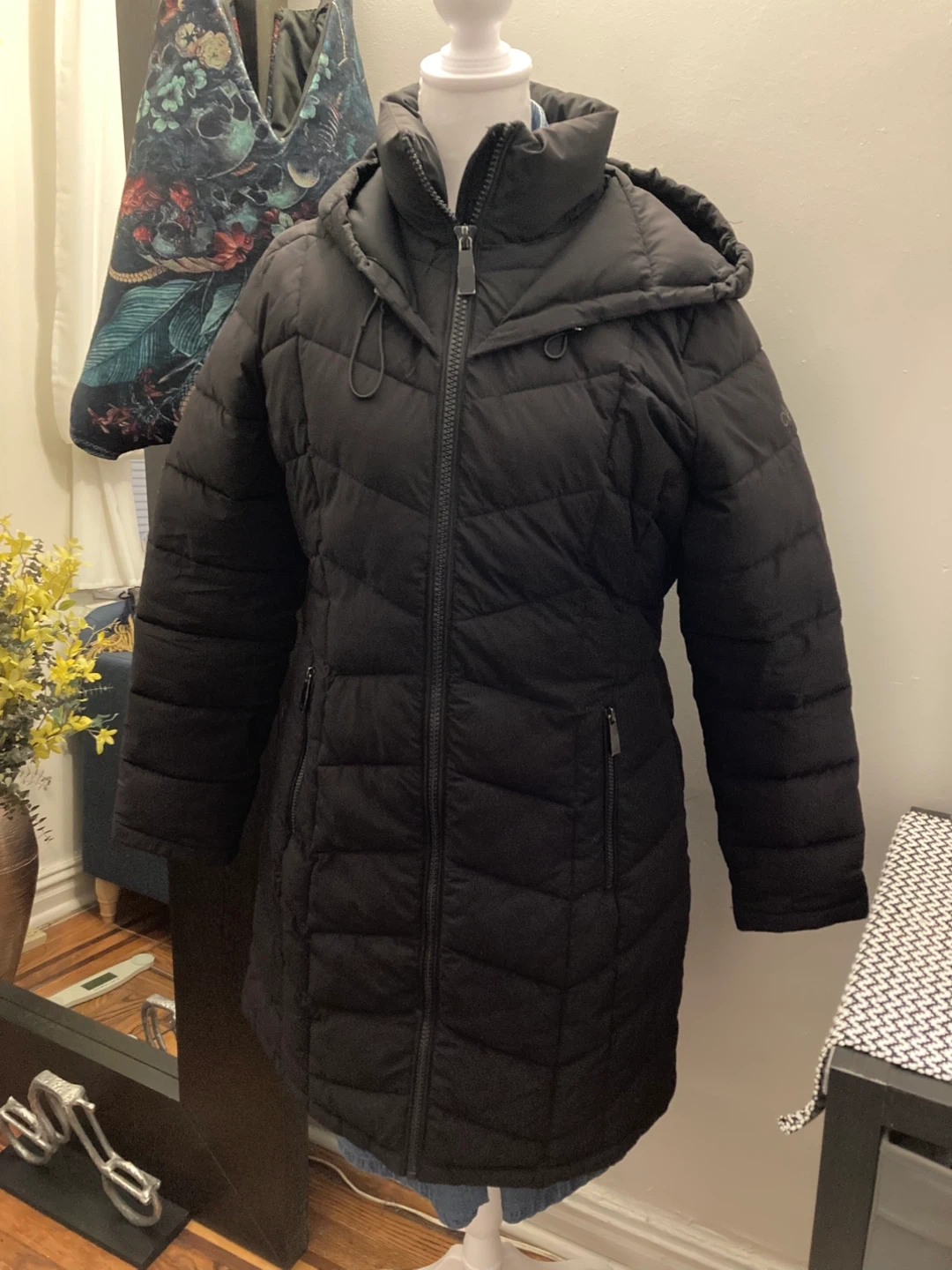 27Selling a Calvin Klein black puffer coat. It's in like new great condition and perfect for staying warm this winter! The coat features a hood and a stylish, quilted design.
