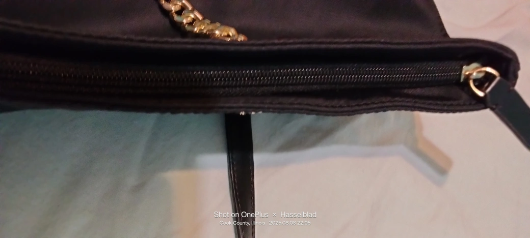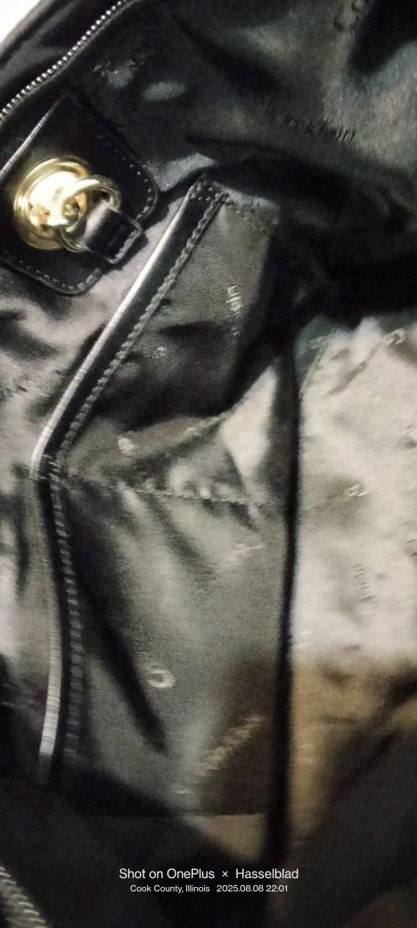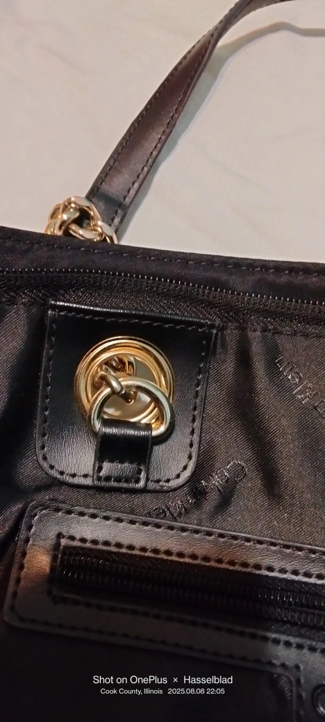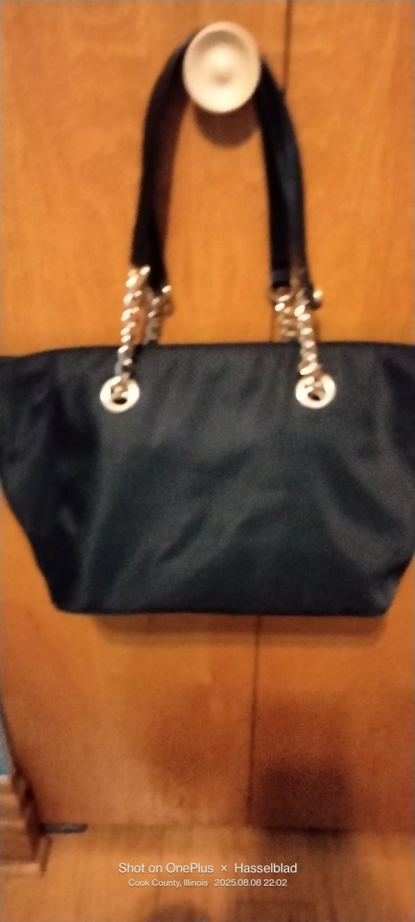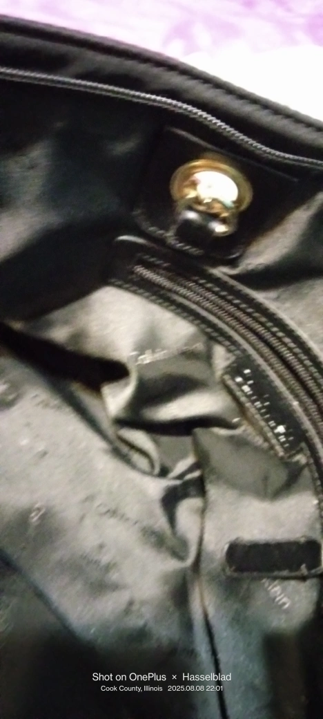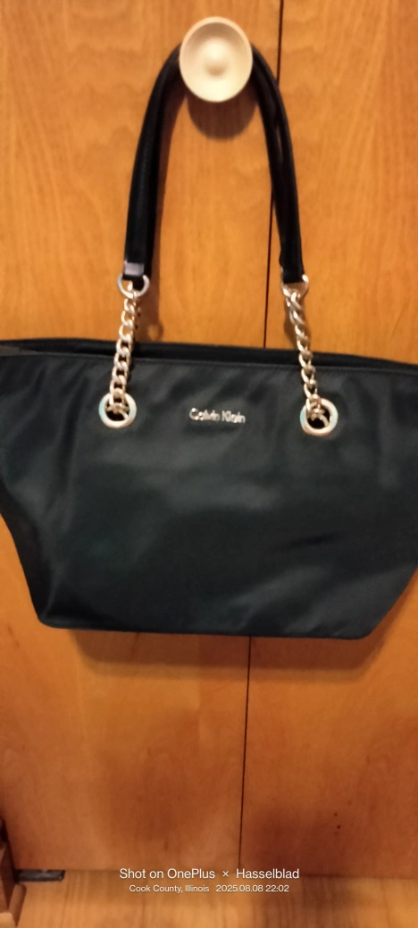 Calvin Klein nylon tote- bag! It features a chain detail on the straps and has a zipper closure. 22"-straps 9" H. 15"W. 9" Never used.