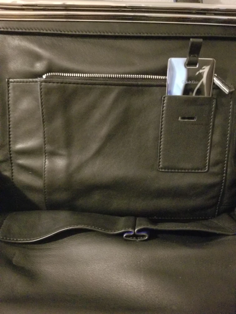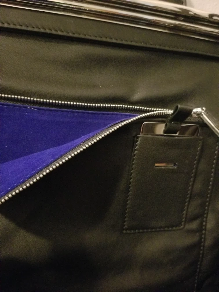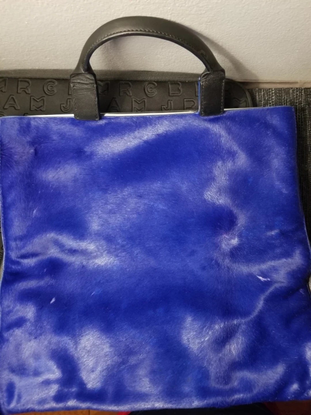 Blue fur tote bag with black leather handles. Top zipper closure. 3 Inside pockets and mirror.