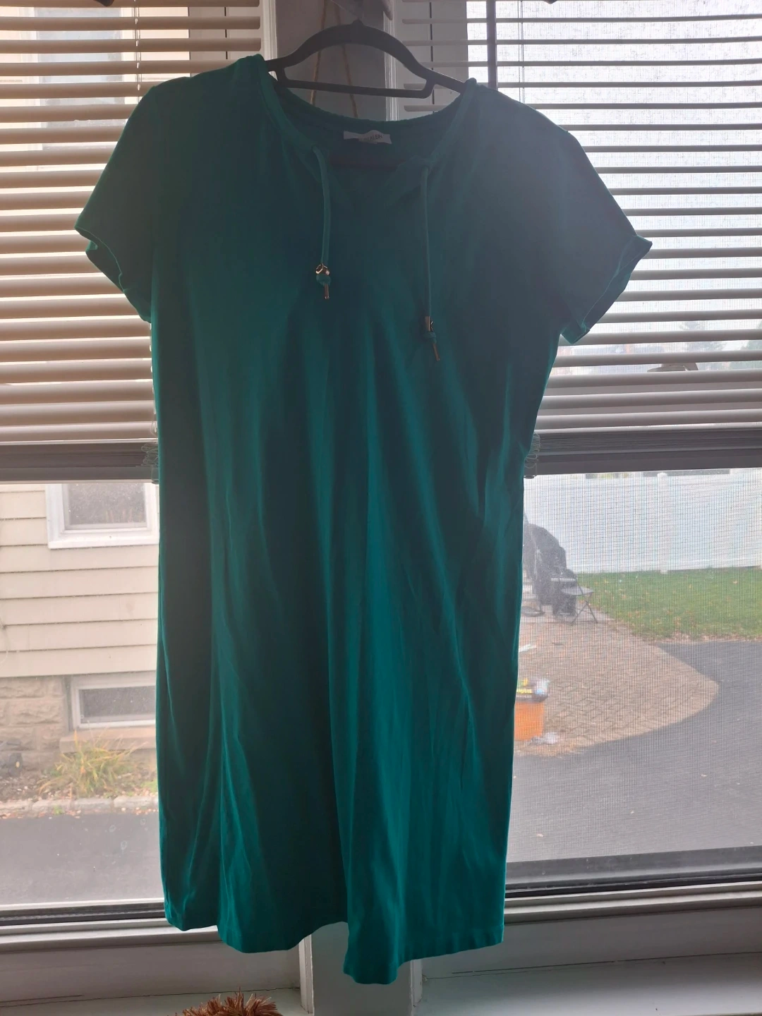 Selling a cute Calvin Klein hoodie dress in a vibrant green color! It's a size large and features a comfortable, relaxed fit. The dress has a V-neck and a hood with drawstrings. Perfect for casual wear or layering!