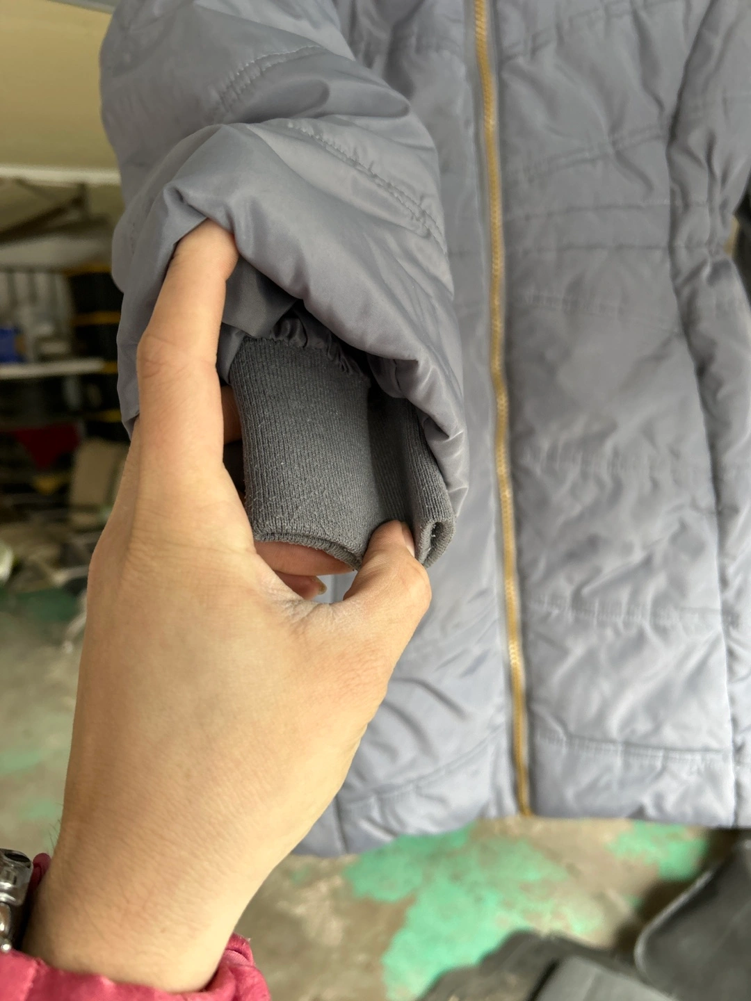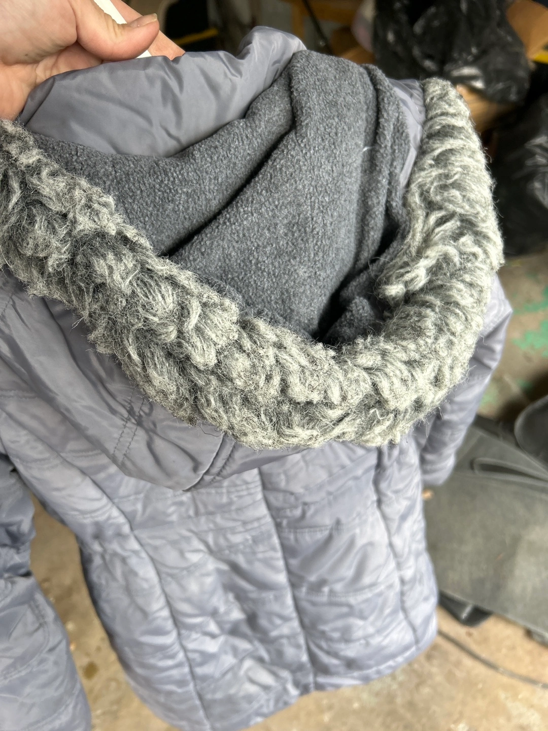106Girls' gray puffer jacket. Size Medium (8/10). Features a fleece-lined hood with faux fur trim and ribbed cuffs. Gold zipper.