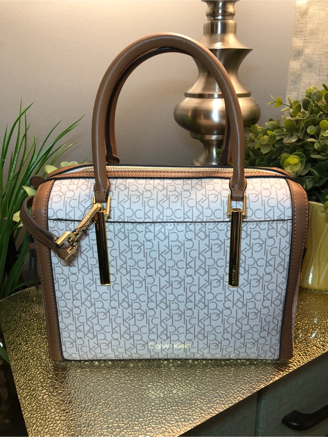 37This is a Calvin Klein satchel bag with a stylish design. It features a pattern of the CK logo throughout the bag. The bag has brown leather-like trim and handles, adding a touch of sophistication. It also comes with a shoulder strap for versatile carrying options