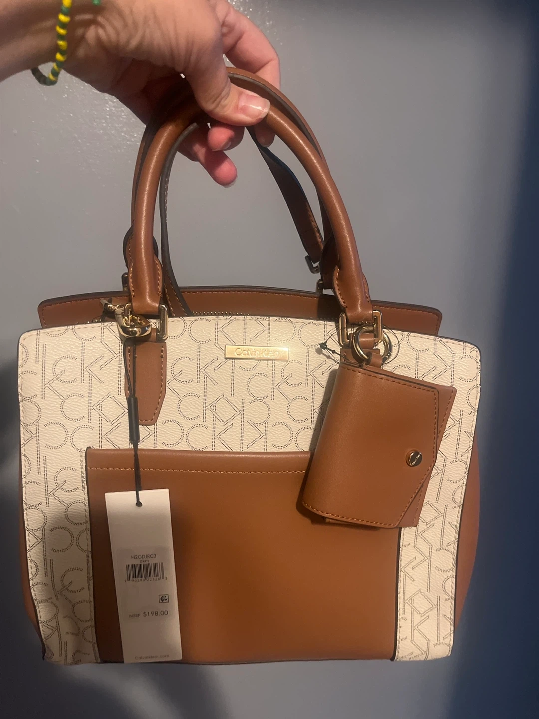 This Calvin Klein satchel is in great condition and ready for a new home! It features a stylish brown and white design. The original price was $198.00