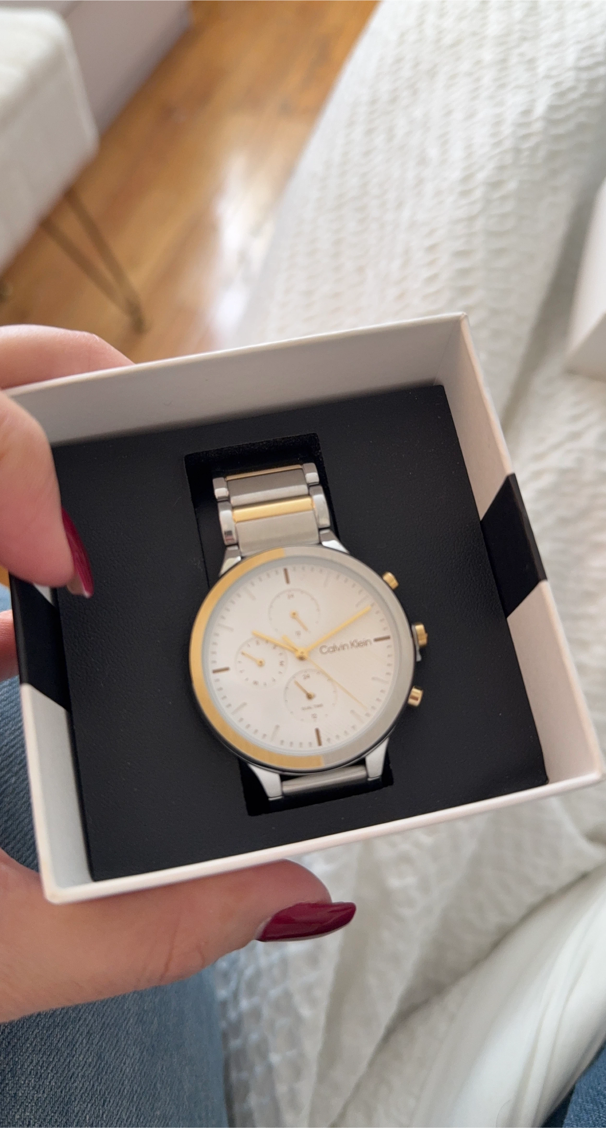 10Selling a stylish Calvin Klein women's watch in a two-tone silver and gold finish! It comes with its original box, making it perfect as a gift or a treat for yourself. The watch is brand new and ready to wear