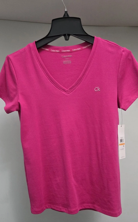 Selling a Calvin Klein V-neck T-shirt in a vibrant pink color! It's in great condition and ready for a new home. The shirt features the classic 'ck' logo. Perfect for everyday wear!