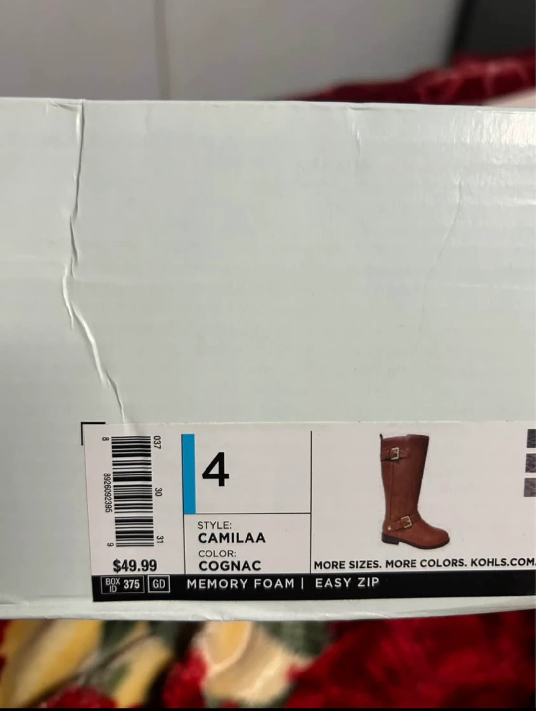 60Selling a NEW pair of Camilaa boots in cognac color, size 4. These feature memory foam insoles and an easy zip closure. The original box is included. These boots were originally $49.99