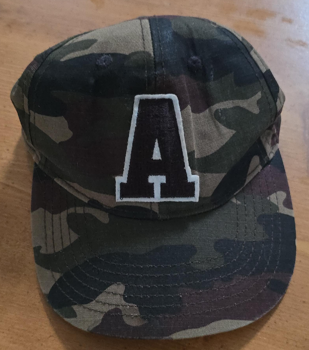 Selling a camo hat with the letter A on it. It's in good condition and ready for a new home!