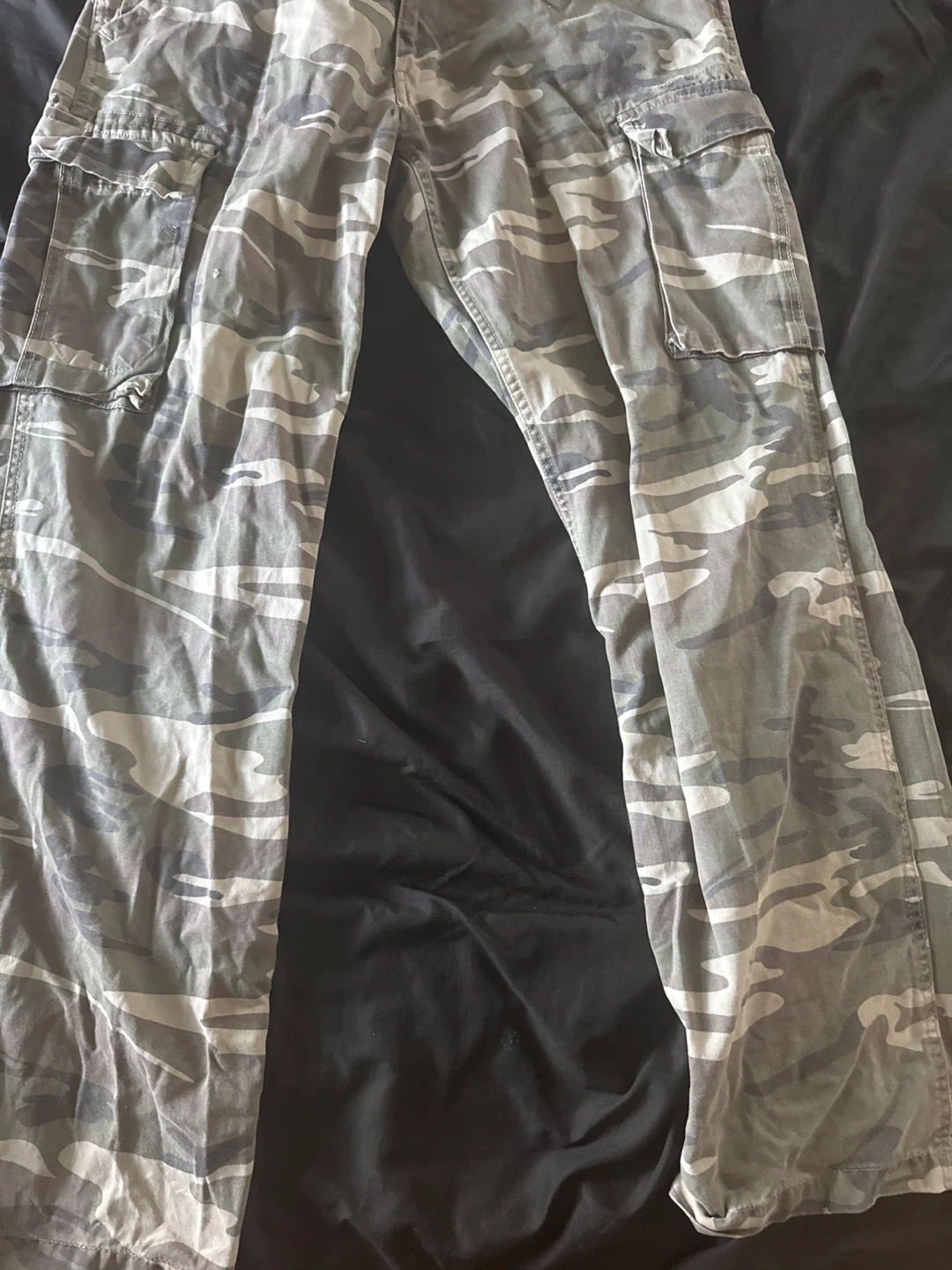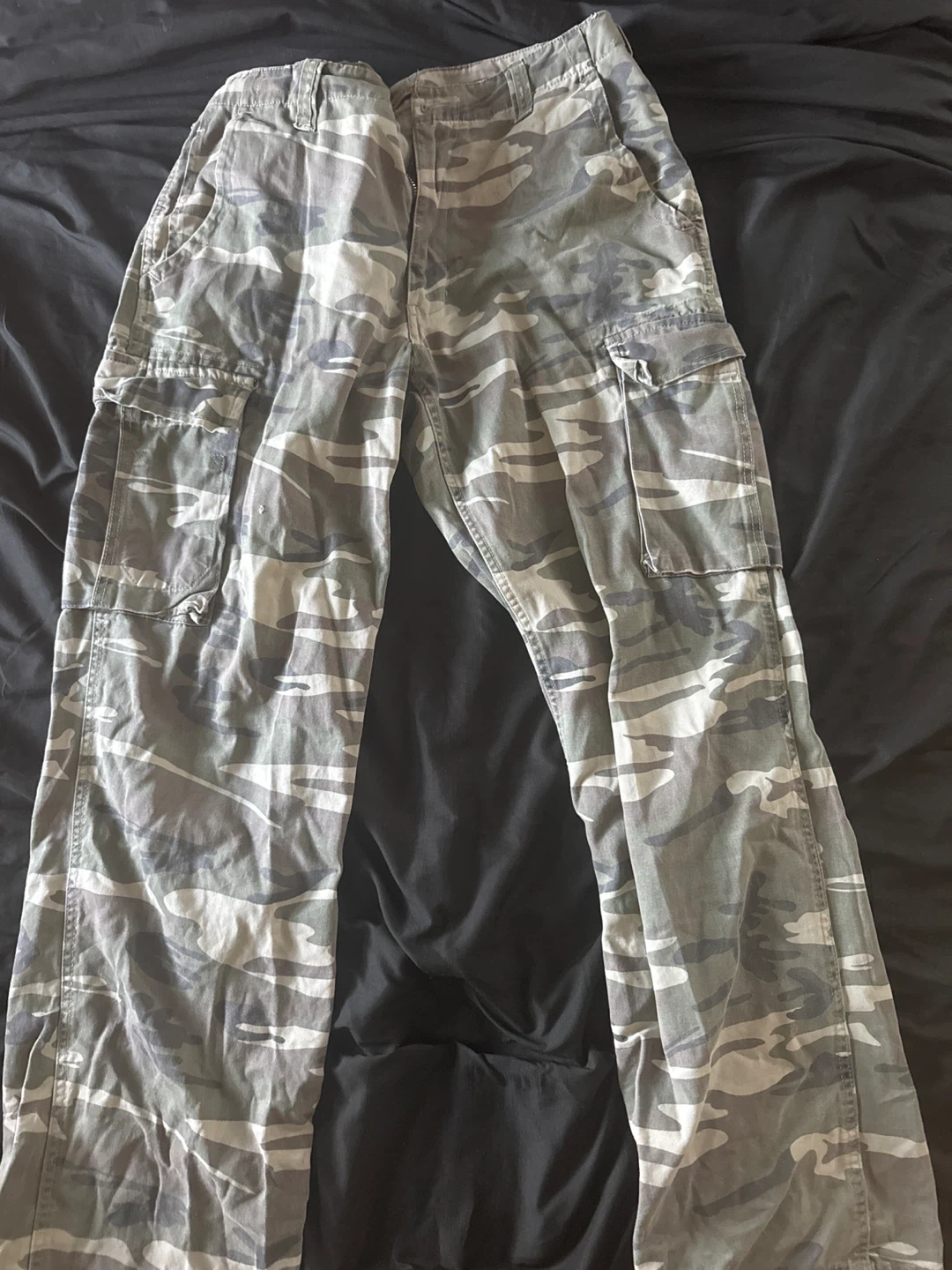 Selling a pair of camouflage cargo pants. They have a cool, rugged look and are perfect for casual wear or outdoor activities. They're in good condition and ready for a new home