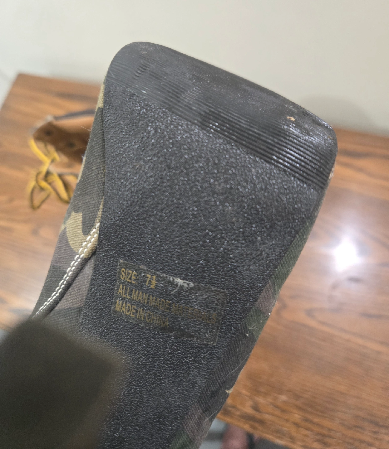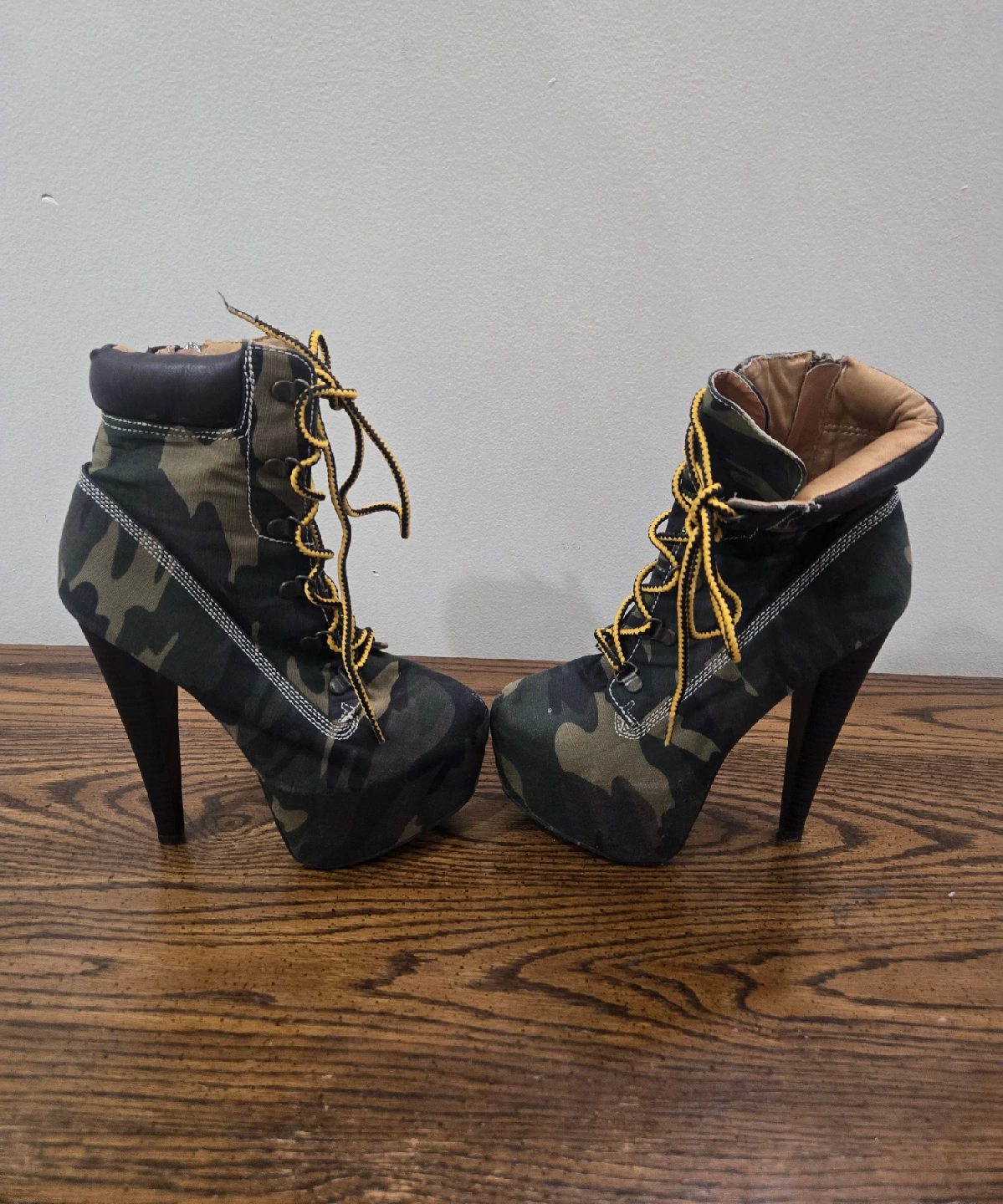 These are camouflage platform heel boots in a women's size 7.5. They have laces and a zipper on the side. They have only been worn a few times.