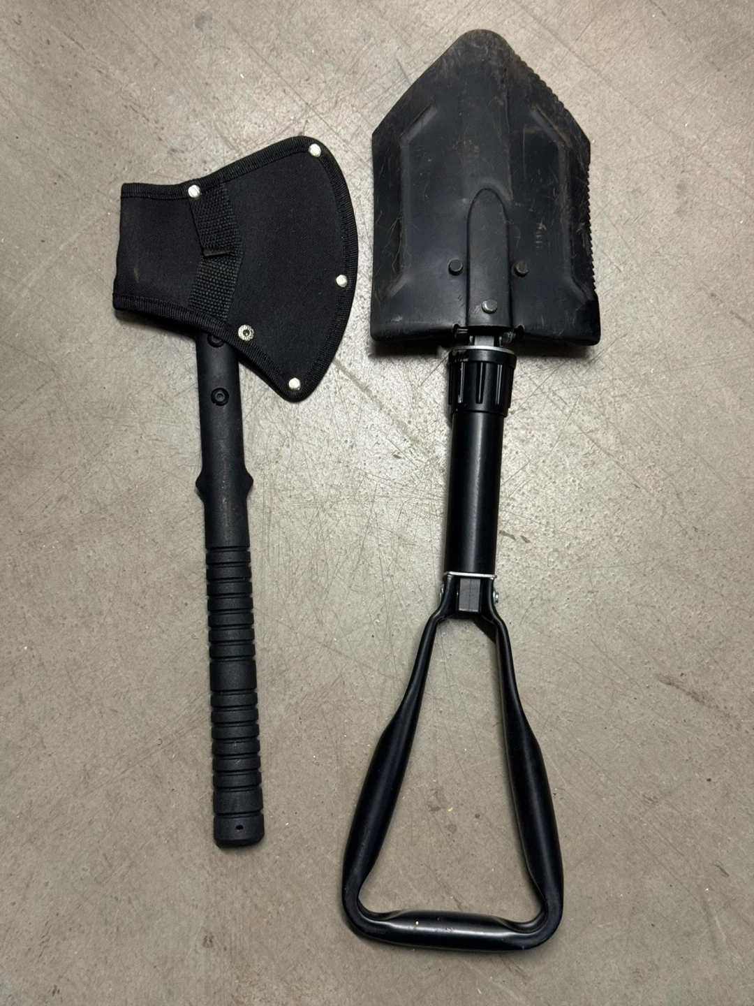 Selling a used camping axe and shovel set. Both items are black and appear to be in good condition. Perfect for outdoor adventures and camping trips