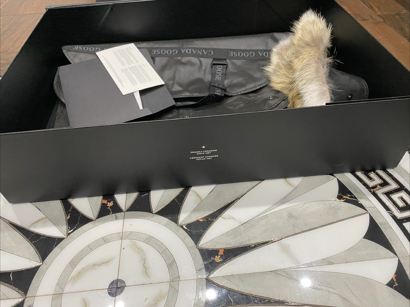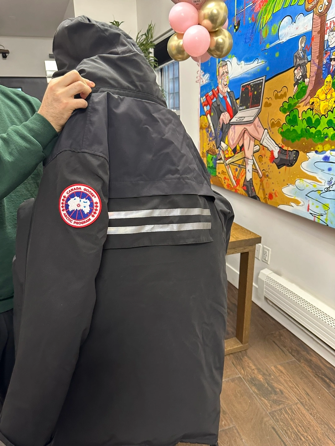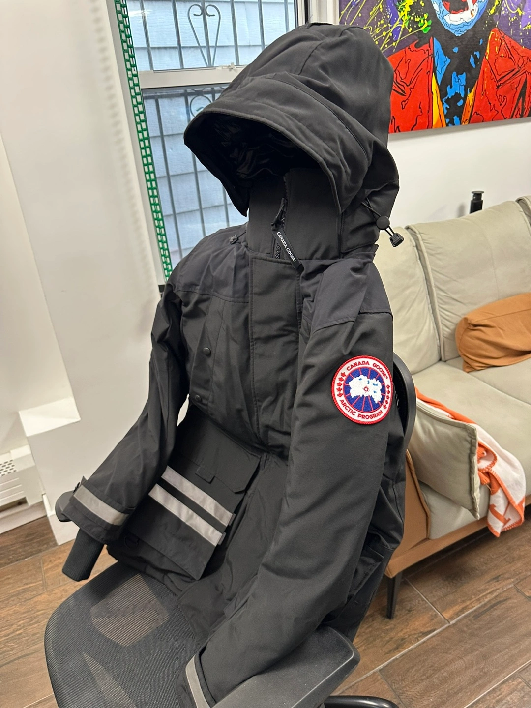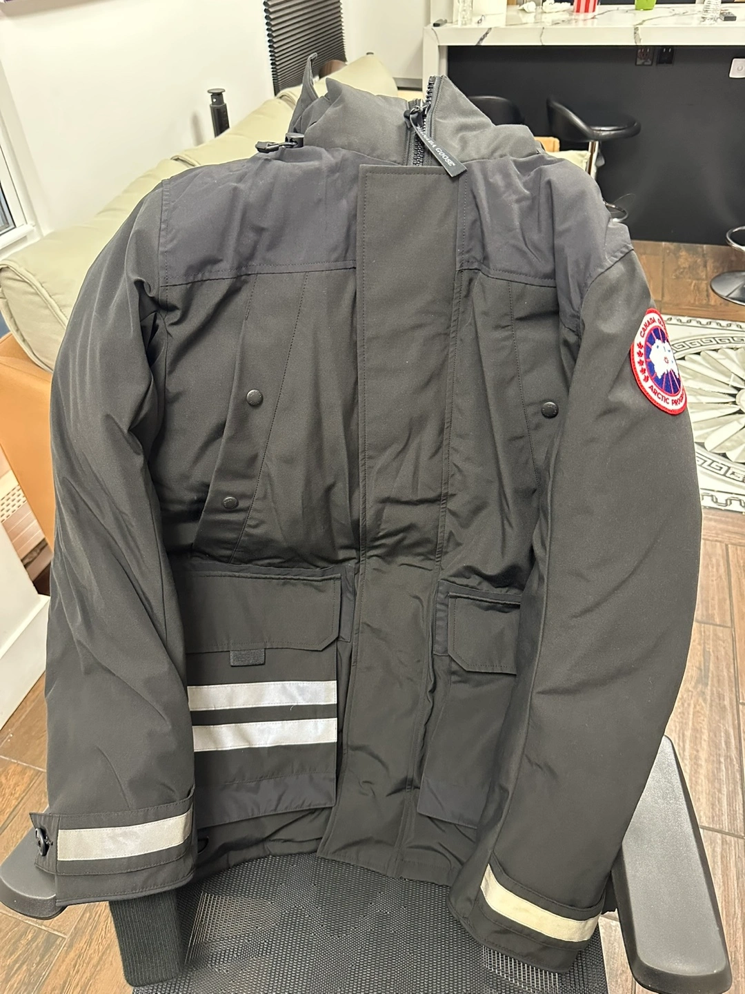 It's a black winter parka, perfect for staying warm during those chilly winter days. Features a hood, multiple pockets, and reflective stripes. A fantastic jacket for the cold season.