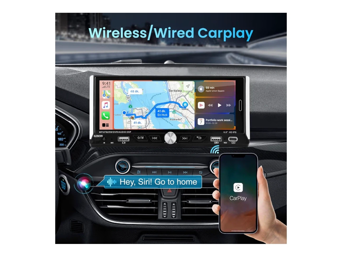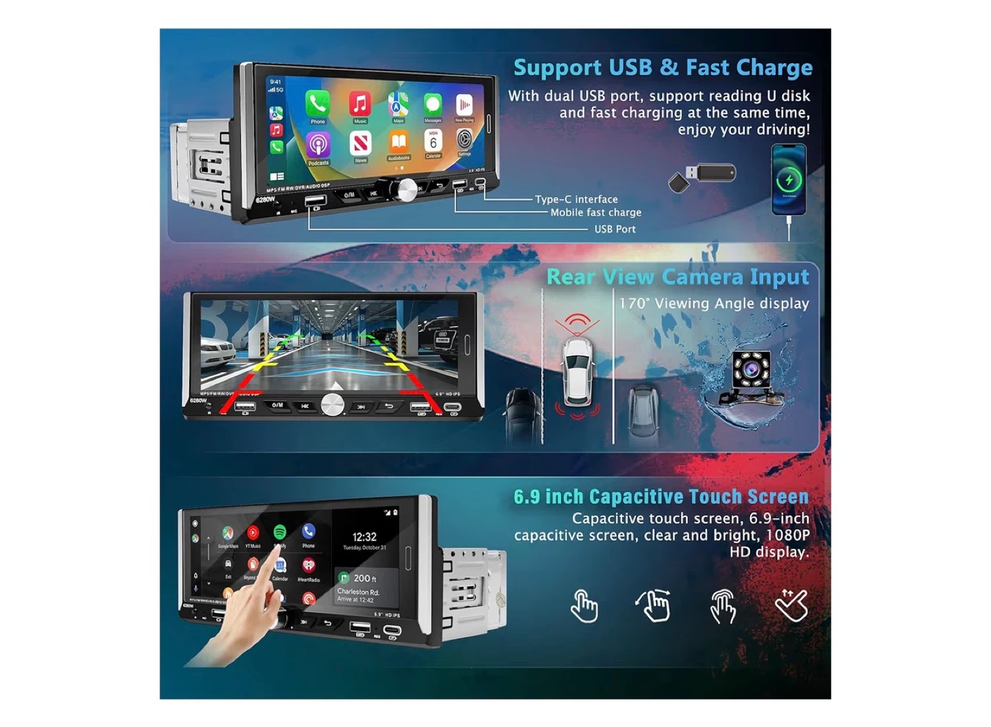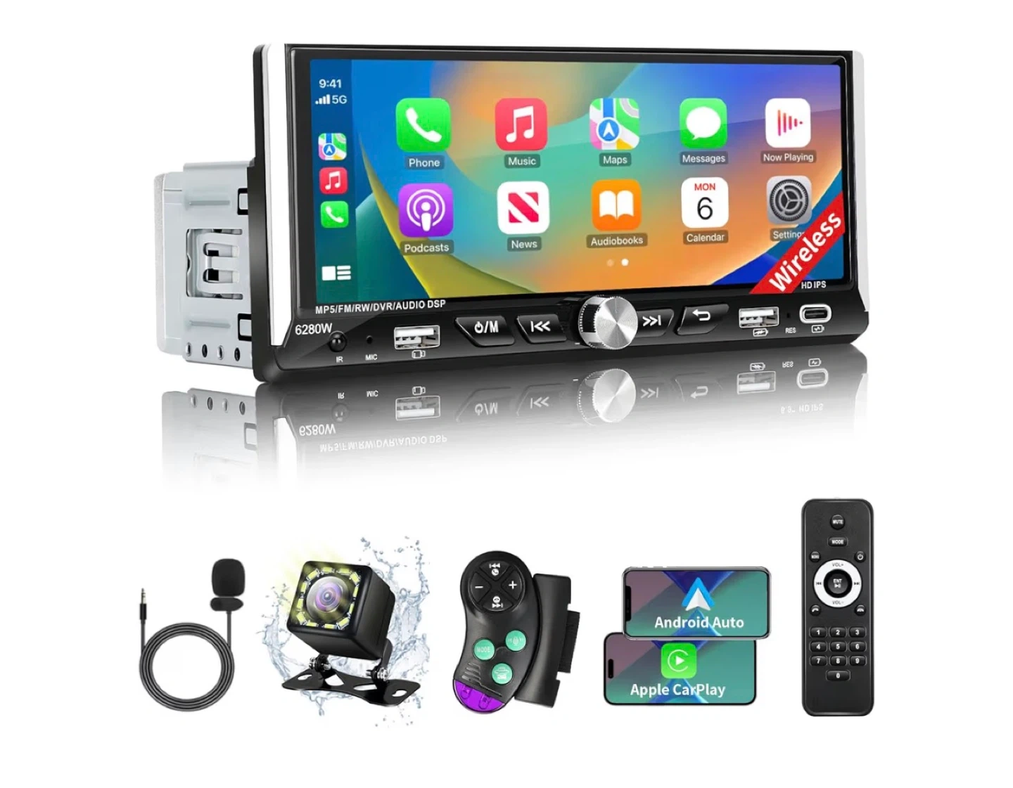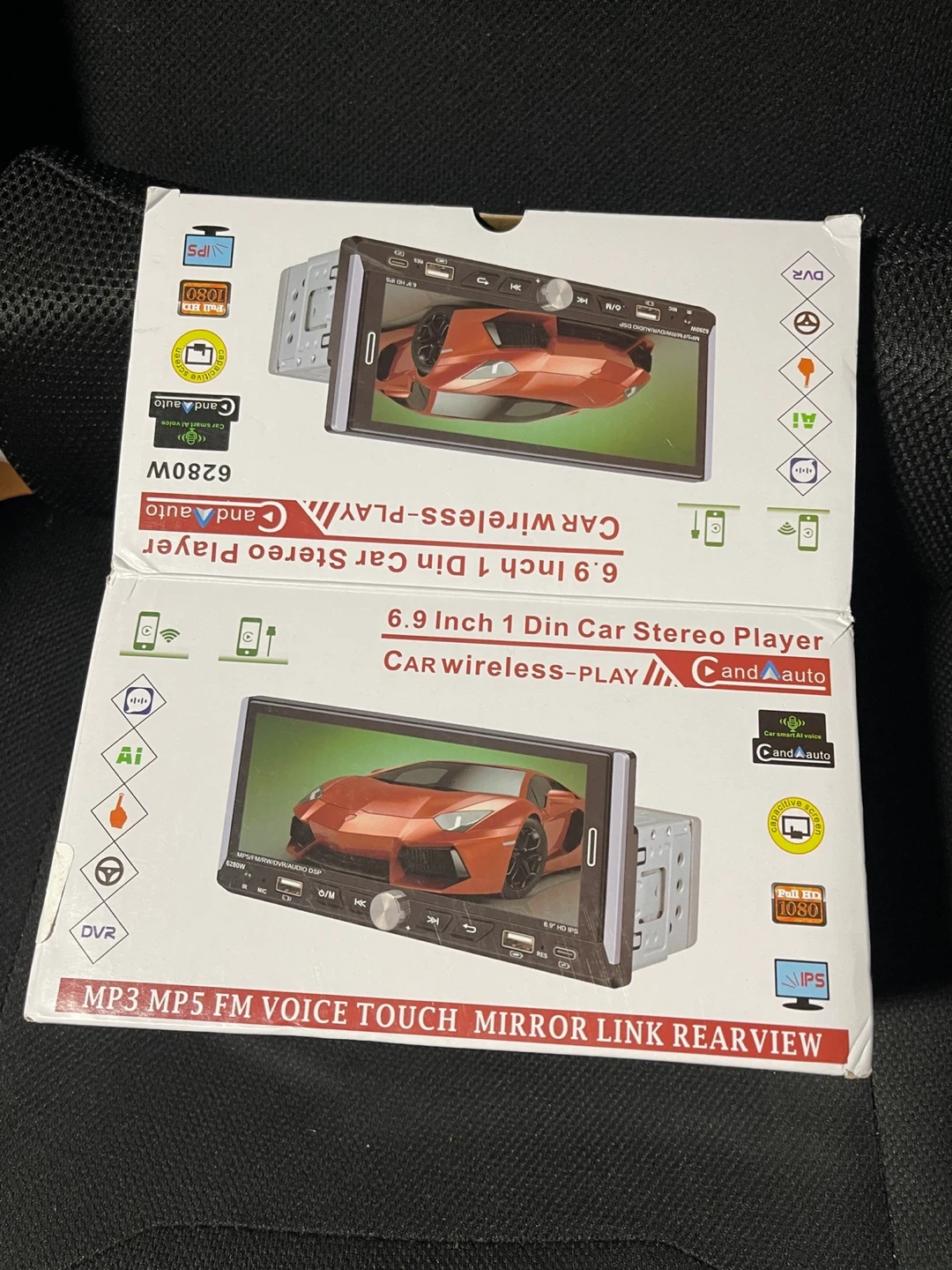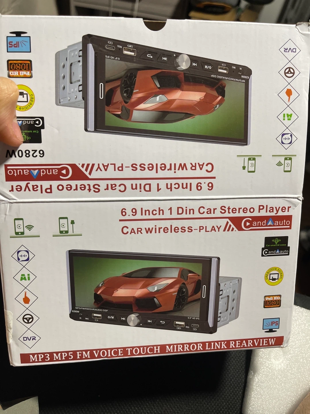 65Selling a brand new Candauto 6.9 inch 1 Din Car Stereo Player! It's still in its original box and includes the operation manual. It features wireless CarPlay, MP3, MP5, FM voice touch, mirror link, and rearview capabilities