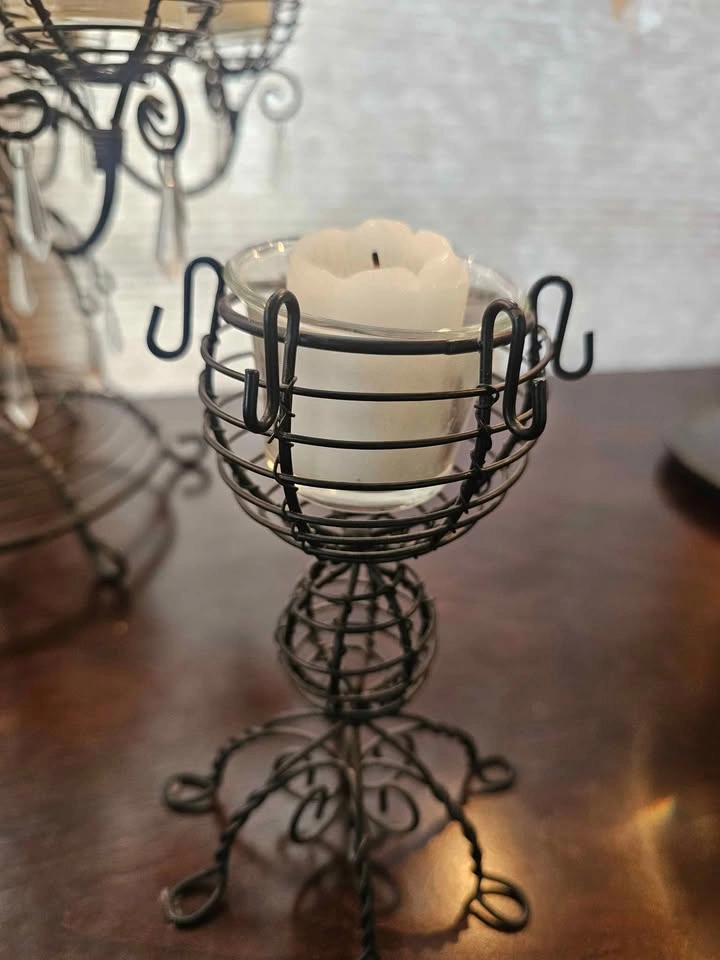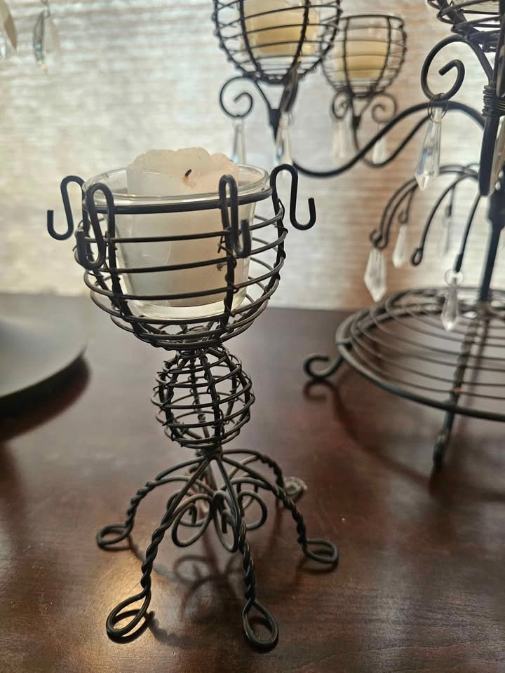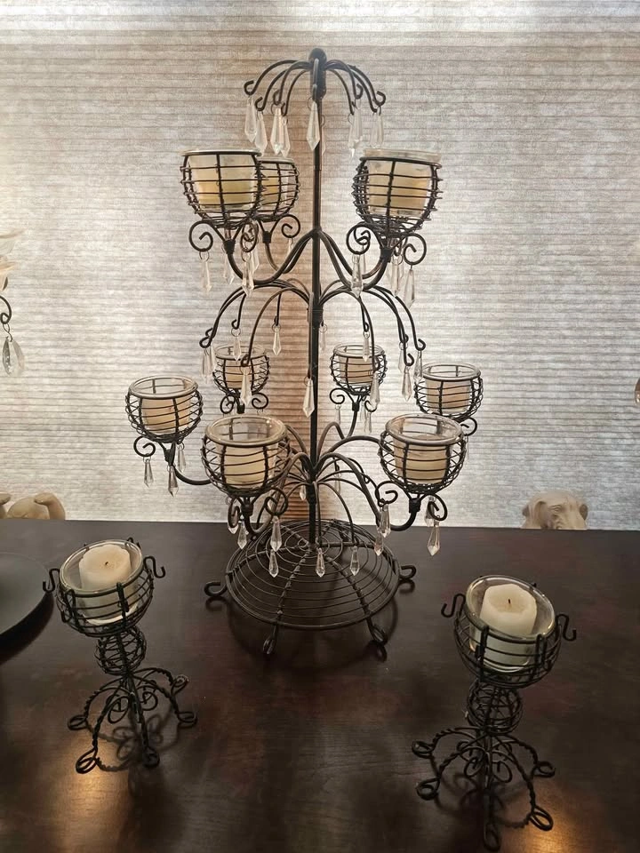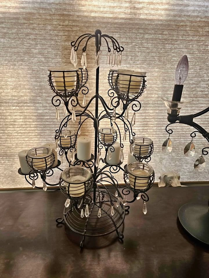 Candle holder with 10 gland trellis votive tealight candles. With two single votive tealight candle holders. Black brass. Candle stand H 22" 14 1/2 W base 8"x8". Single candle holder 7" H 4"W. Sell as a set. Door pick up and cash only $30 for set