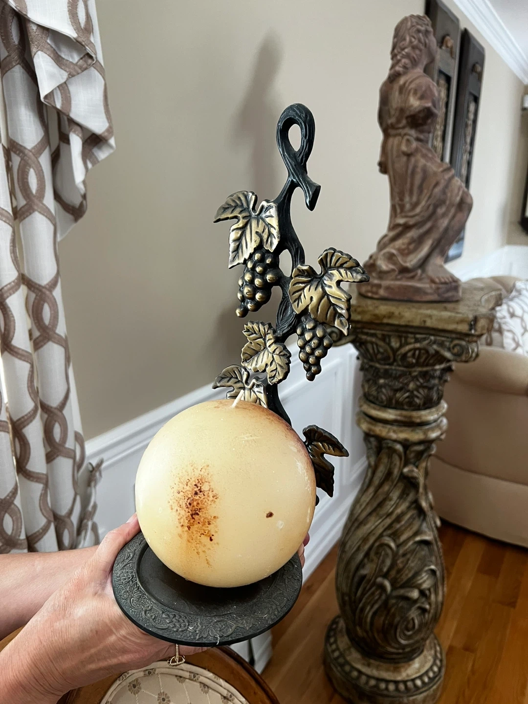 10This is a round candle holder with a grape design! It has a round candle on a small plate, with a metal grape vine design attached to the back. It's a unique piece that would add a touch of elegance to any room