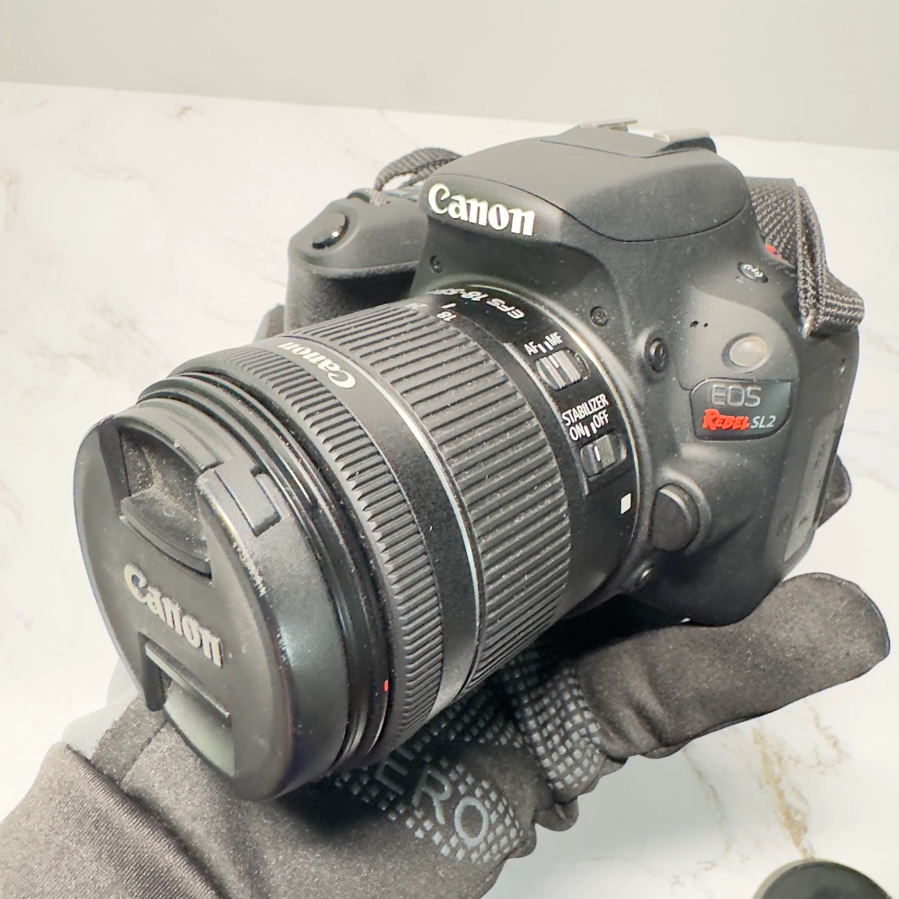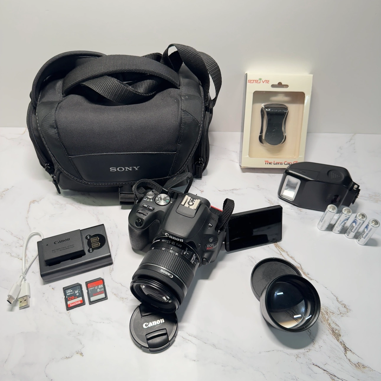25Canon EOS Rebel SL2 24MP Camera with Lens & Accessories Includes: • Canon EOS Rebel SL2 24MP camera body • EF-S 18-55mm f/4-5.6 IS STM lens • Flash • Extra lens • 2 SD cards • Battery and charger • Camera bag • Lens cap Key features: • 24.2MP APS-C CMOS sensor • DIGIC 7 image processor • 3” Vari-Angle touchscreen LCD • Full HD 1080p video recording at 60 fps • 9-point AF system with Dual Pixel CMOS AF • ISO 25600 (expandable to ISO 51200) • 5 fps continuous shooting • Built-in Wi-Fi, NFC, and Bluetooth Perfect for both photography and video, in excellent condition. Message me for more details or to arrange a pick-up!