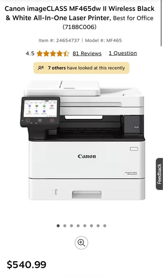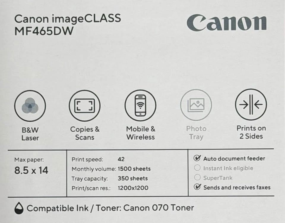 Canon imageCLASS MF465dw II Wireless Black & White All-In-One Laser Printer Bought Brand New For $540 + Tax Box is still sealed, never opened or used Comes with Cannon 070 Black Toner