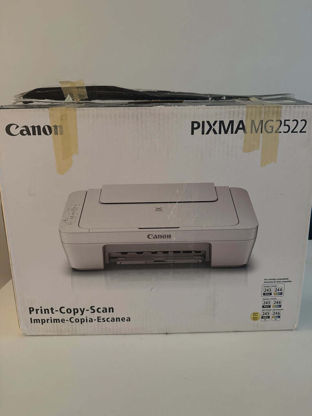 177Canon PIXMA MG2522 printer in its original packaging. It is a multifunction printer with a print, copy, and scan option. The box includes information about ink cartridge compatibility.